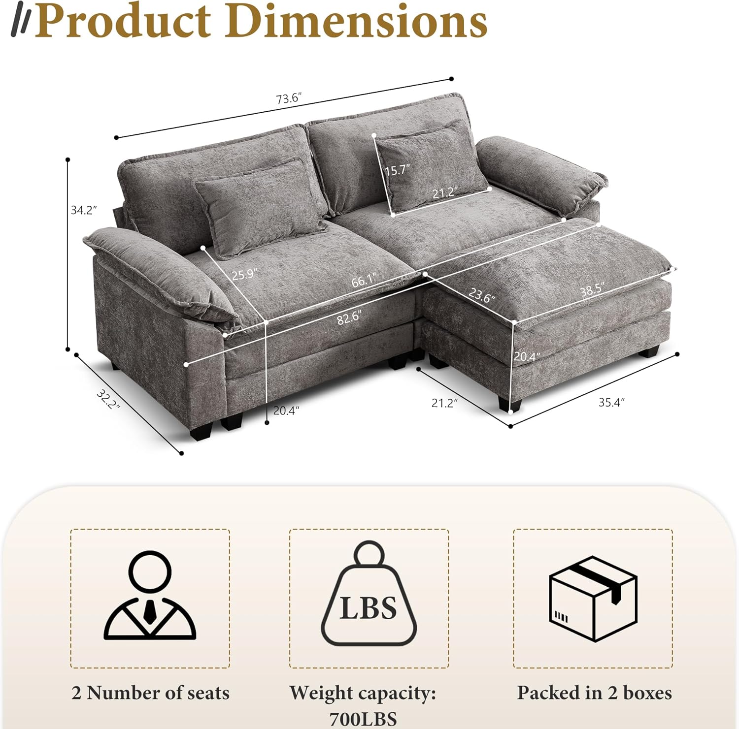 • Easy to Assemble: Comes with clear instructions and tools,this sectional couch can be easily assembled in 30 minutes.Couch Dimensions: 86''(W)*57''(D)*34.6''(H). Weight Capacity: 300 lbs. each seat, It can hold 2-3 people to sit on, and you can also feel free to take a nap on the sofa