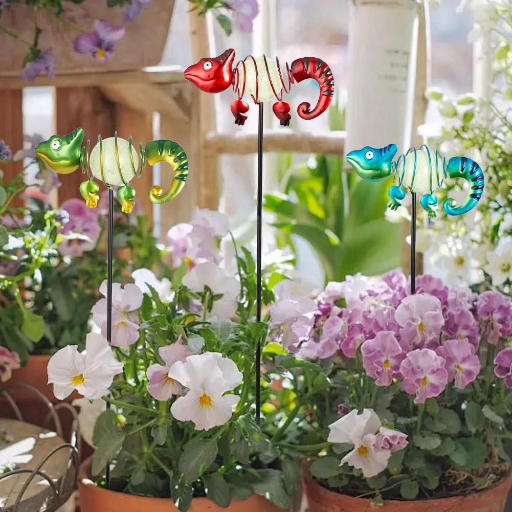 • Unique Design: These garden stakes are designed in the shape of vivid chameleons. The bright and eye-catching colors, including red, blue, and green, can quickly become the focal point of any garden. Each chameleon has a detailed and cute appearance, adding a touch of fun and liveliness to your outdoor space