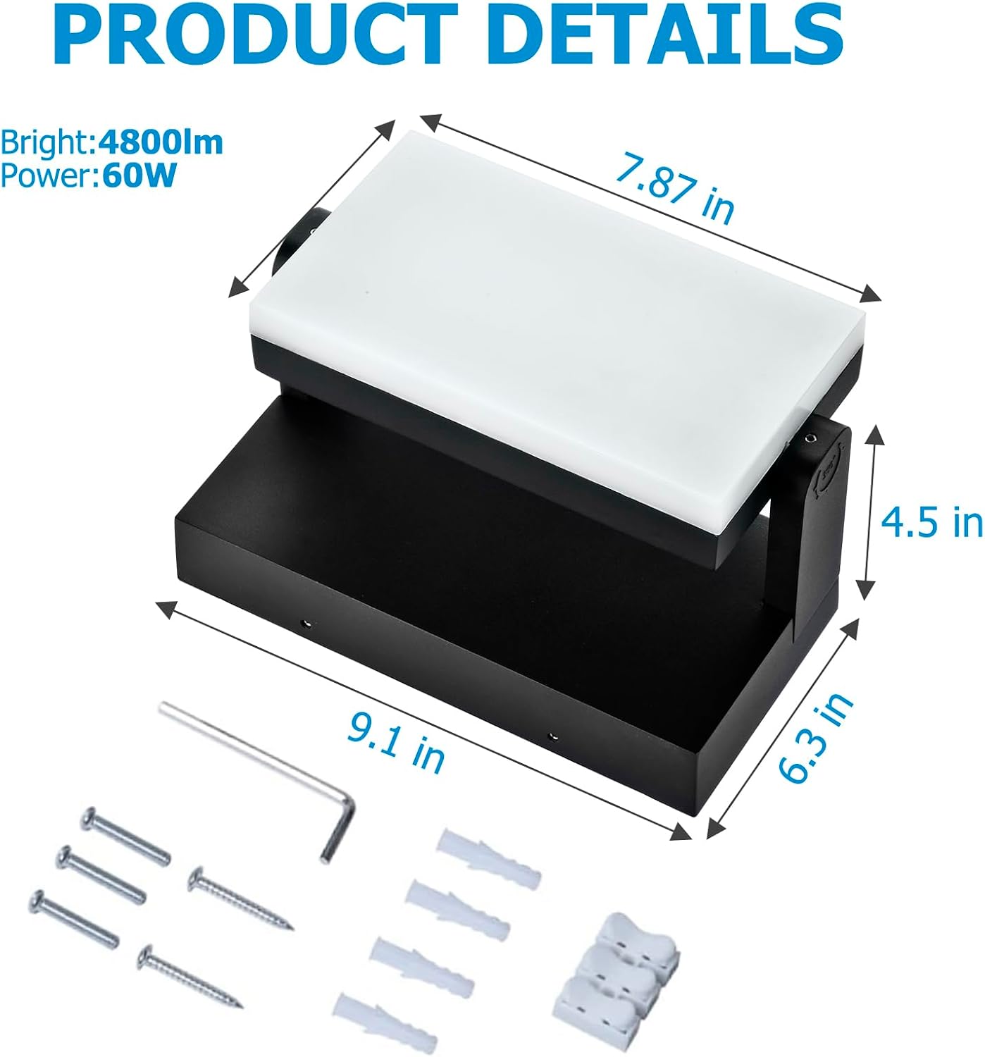 • Super Bright & Anti-glare: wall pack light Bright up to 4800lm but not dazzling! the outdoor wall lighting provide excellent illumination for any space, Equipped with 105 high-end LED lamp beads .the 4800LM/60W outdoor security lights can cover a lighting area of 3500 sq.ft. This wall flood light is very modern and stylish, and can decorate your house in all directions.