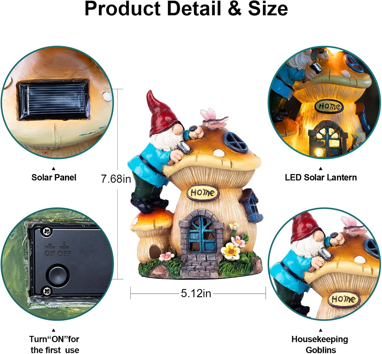 • 【Unique and Creative Design】This solar garden gnome statue is full of fantasy and creativity with the theme of gnomes building mushroom houses. Place it in the courtyard, as if you are instantly in the fairy tale world, adding a unique charm to your outdoor space.