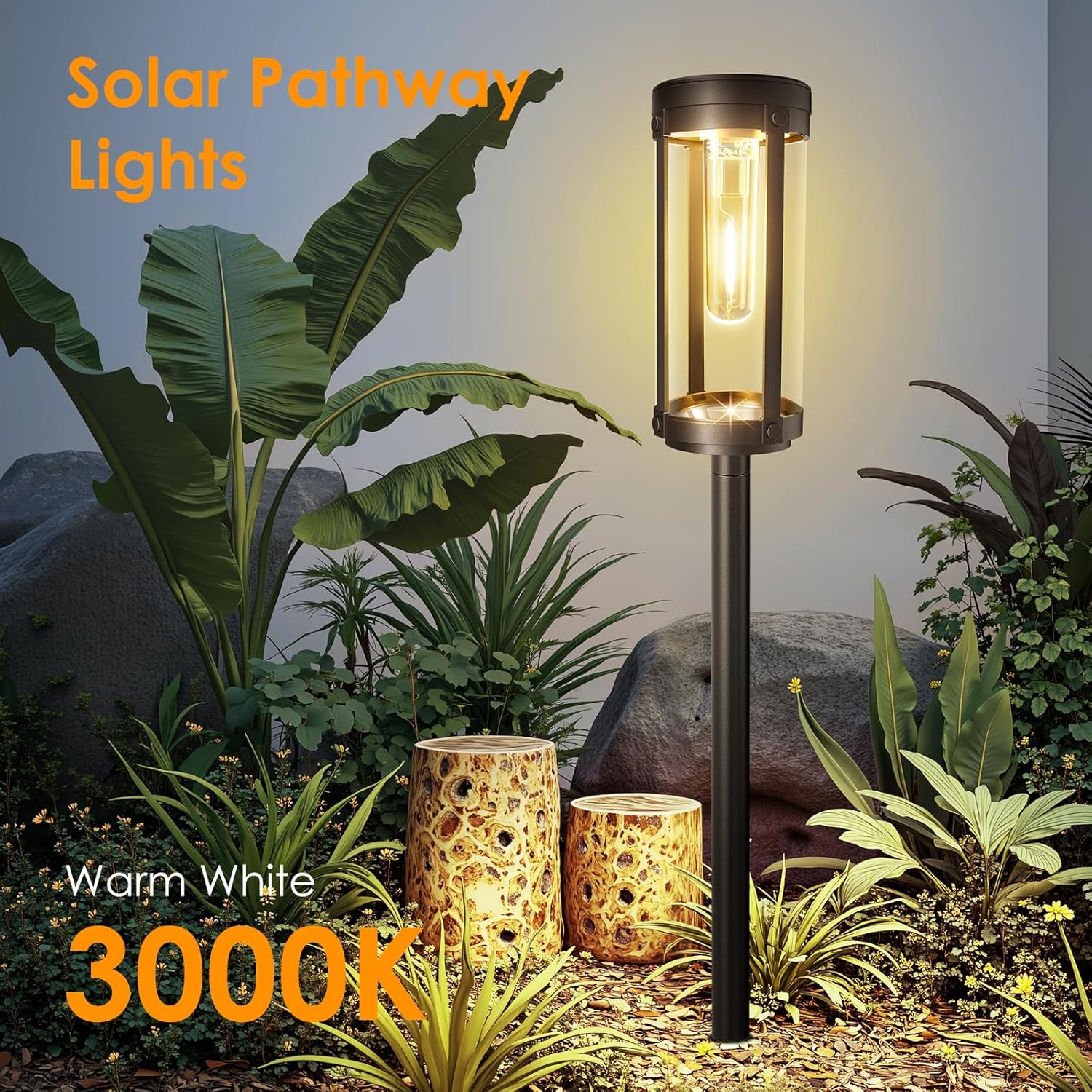 • Unique & Elegant Design: Compact Size for women easily hand-held. The solar lights outdoor waterproof feature warm white tungsten filament bulbs placed within high transparency, thicker lampshades. Long window for light - simple design, makes our solar yard lights brighter and more durable. Flexible height- decent quality is great for a path border or background. These walkway solar lights for outside can project unique light and shadow, creating a romantic and warm atmosphere for your home