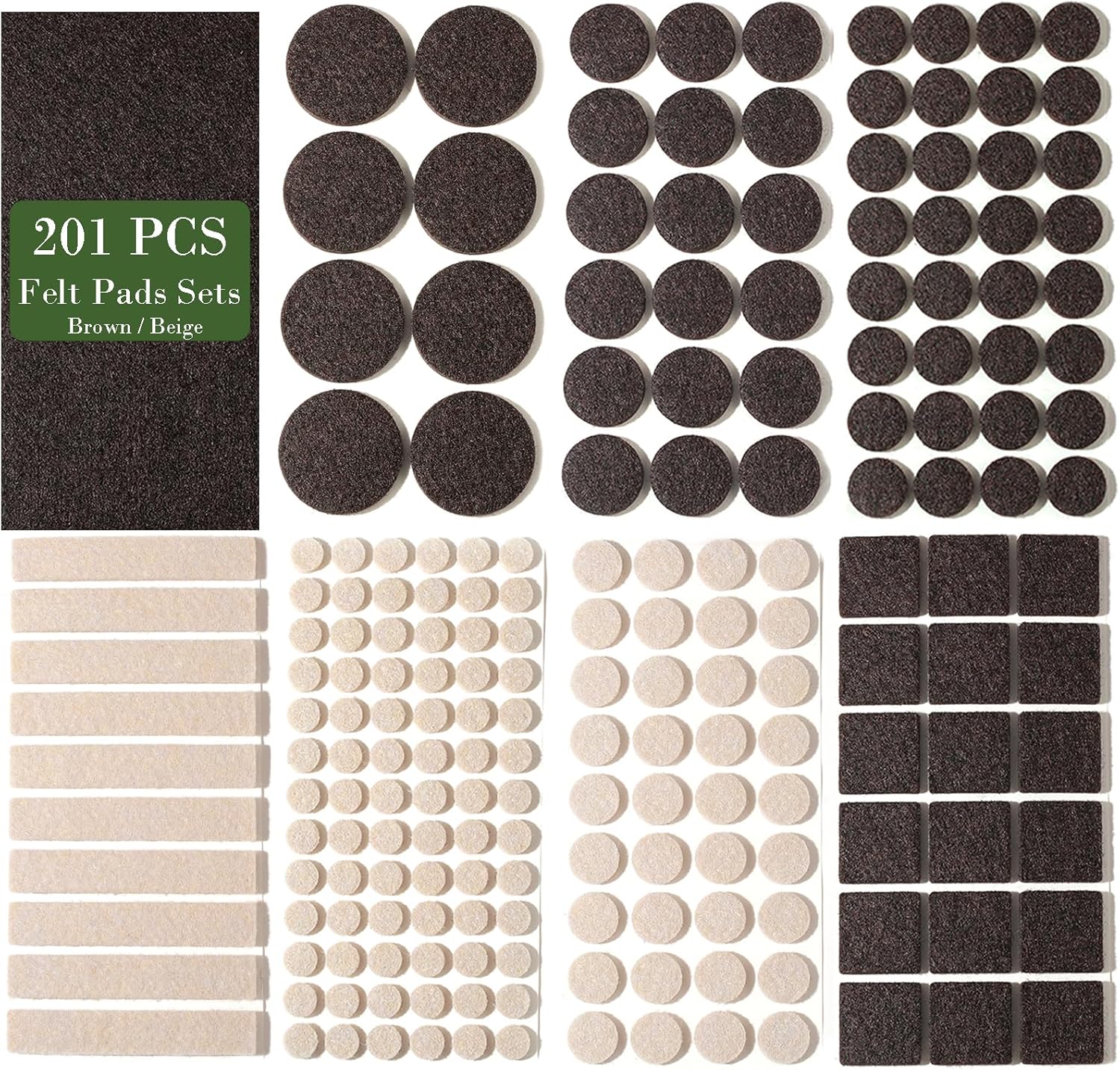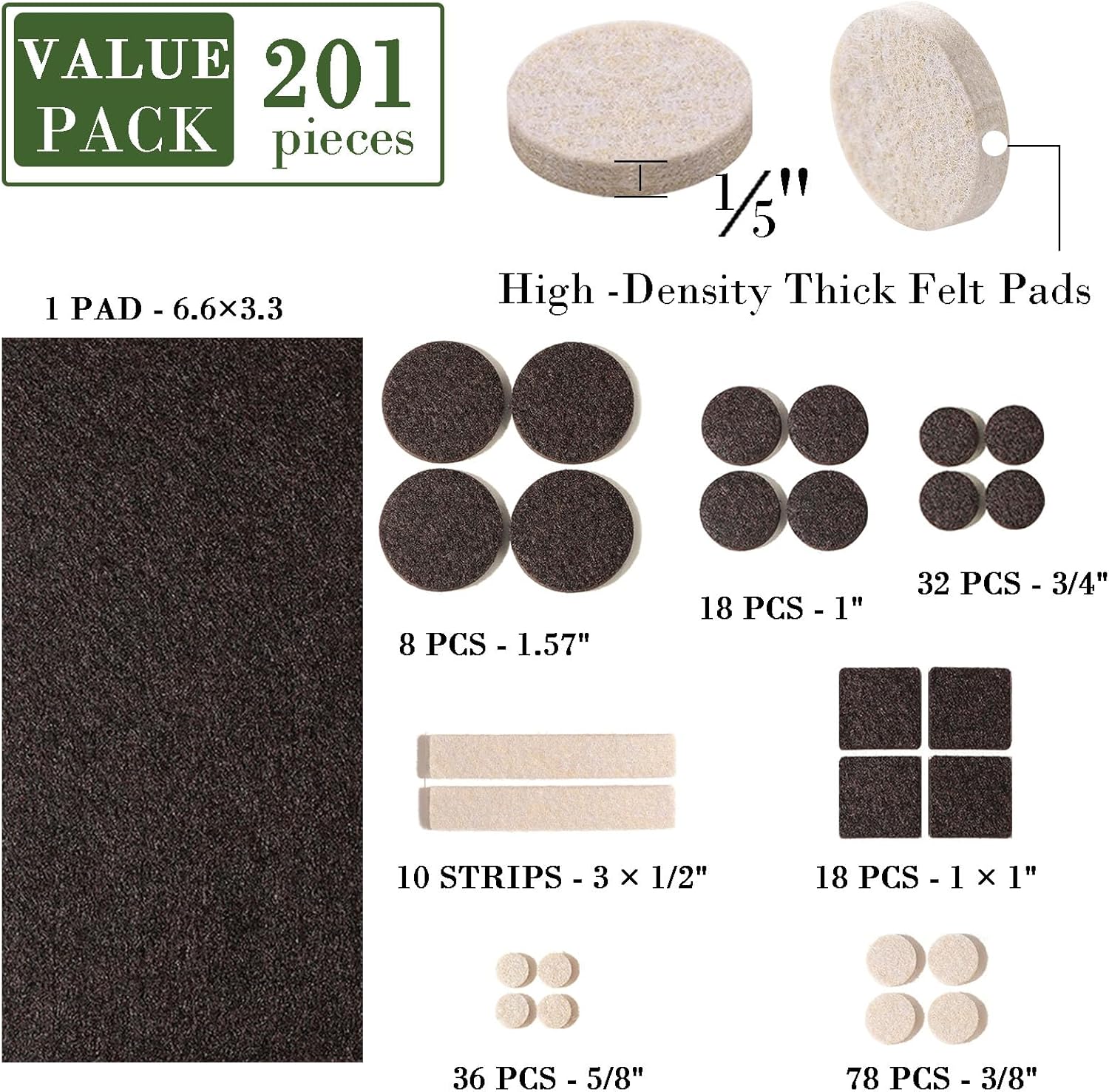 • 201 Pcs Felt Furniture Pads Includes: Round Felt Pads: (8) 1.57", (18) 1", (32) ¾", (78) 3/8", (36) 5/8", Strip Felt Pads: (10) 3"x1/2", Square Felt Pads: (1) 6.6×3.3", (18) 1×1", All sizes can be trimmed for use on different furniture legs.