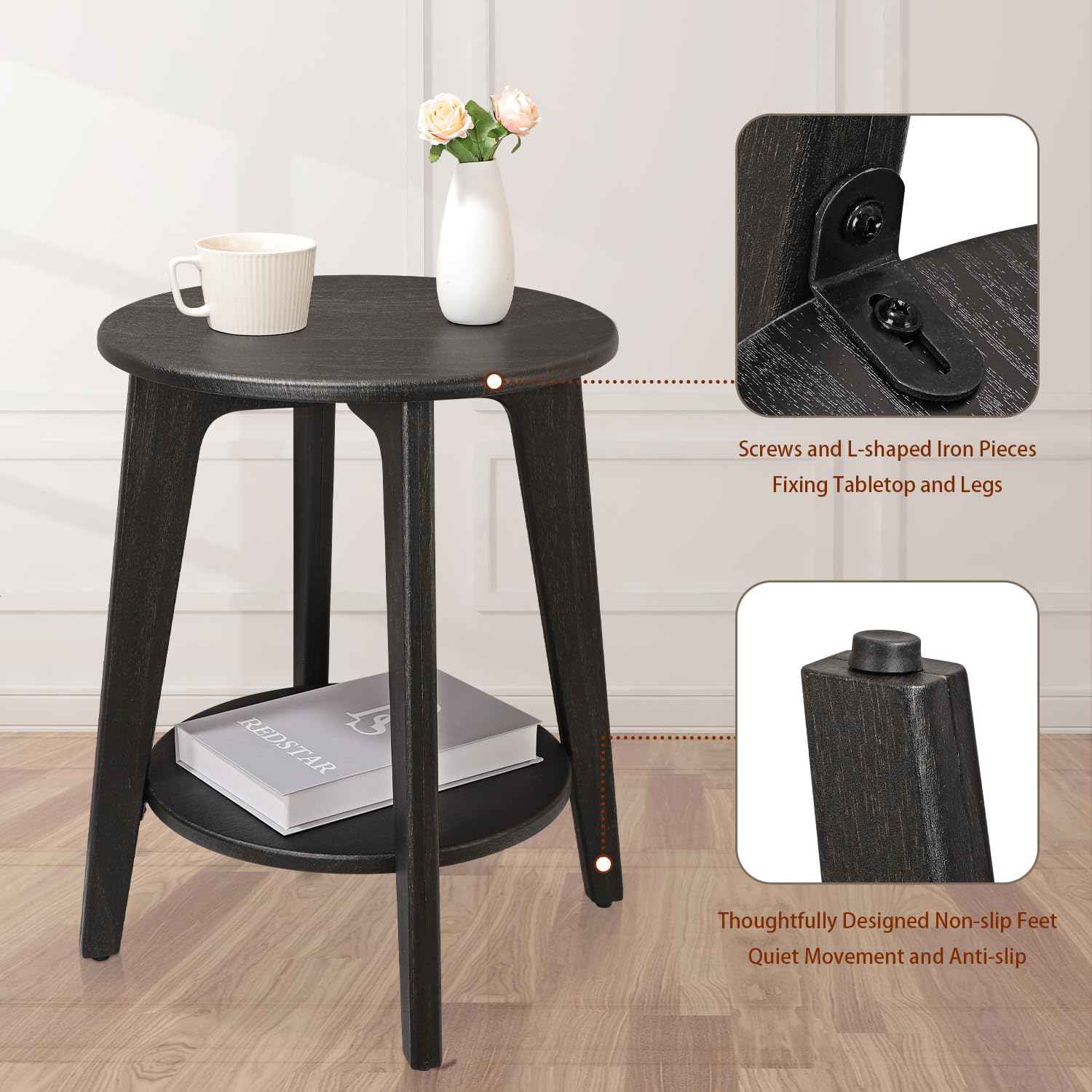 Round Side Table Black Gold Wooden End Table with Lower Shelf Rustic Vintage Nightstand Beside Table for Living Room Bedroom Small Spaces