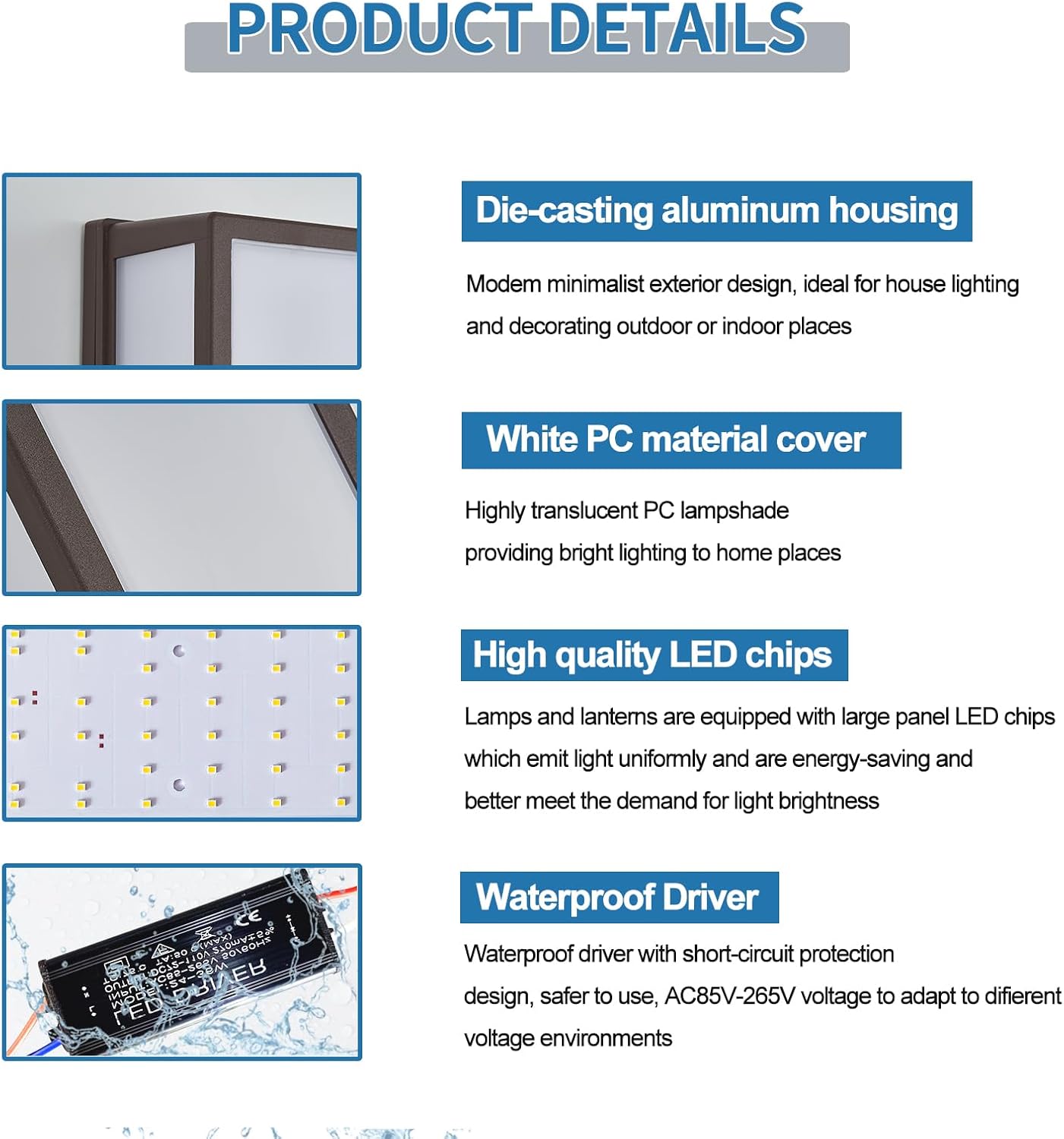 • Safe and Energy Saving:Exterior wall light total power:30W, high quality LED chip, 3000K warm light, (cannot be dimmable), beam soft uniform, low energy consumption;waterproof strip and waterproof driver: short circuit protection design, safer to use;providing enough lighting for your home