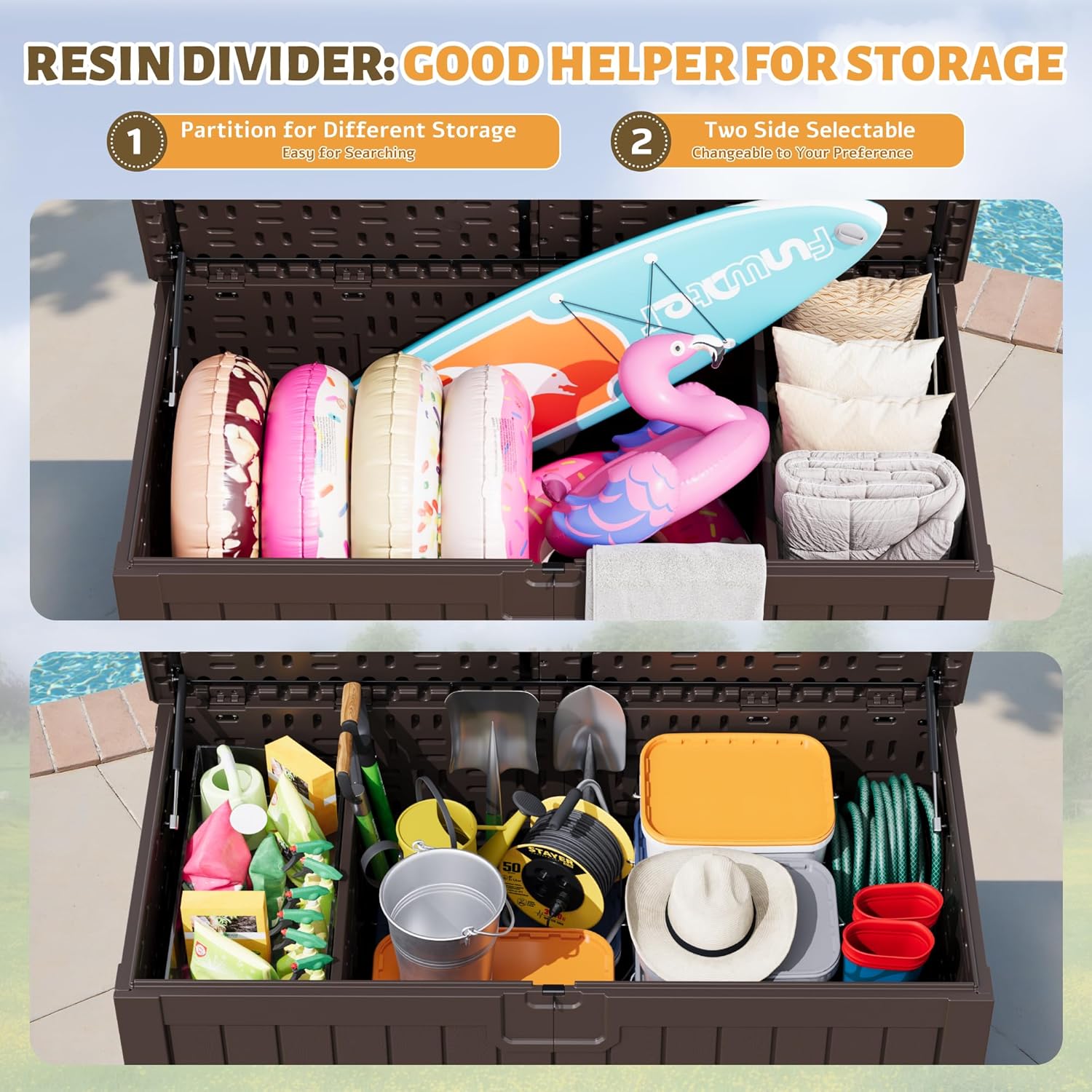 • [250 Gallons of Storage Space] 250 gallons of large storage box space, you can put your planting tools, pool equipment in it, with armrests on both sides, you can move it anywhere