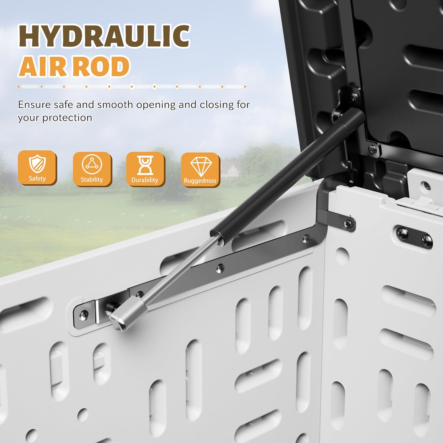• [Safety Design]We choose hydraulic rods to connect the cover and the box, which buffers at the time of opening and closing, greatly ensuring the safety. In addition, the design of locker is a good helper for your safety of property