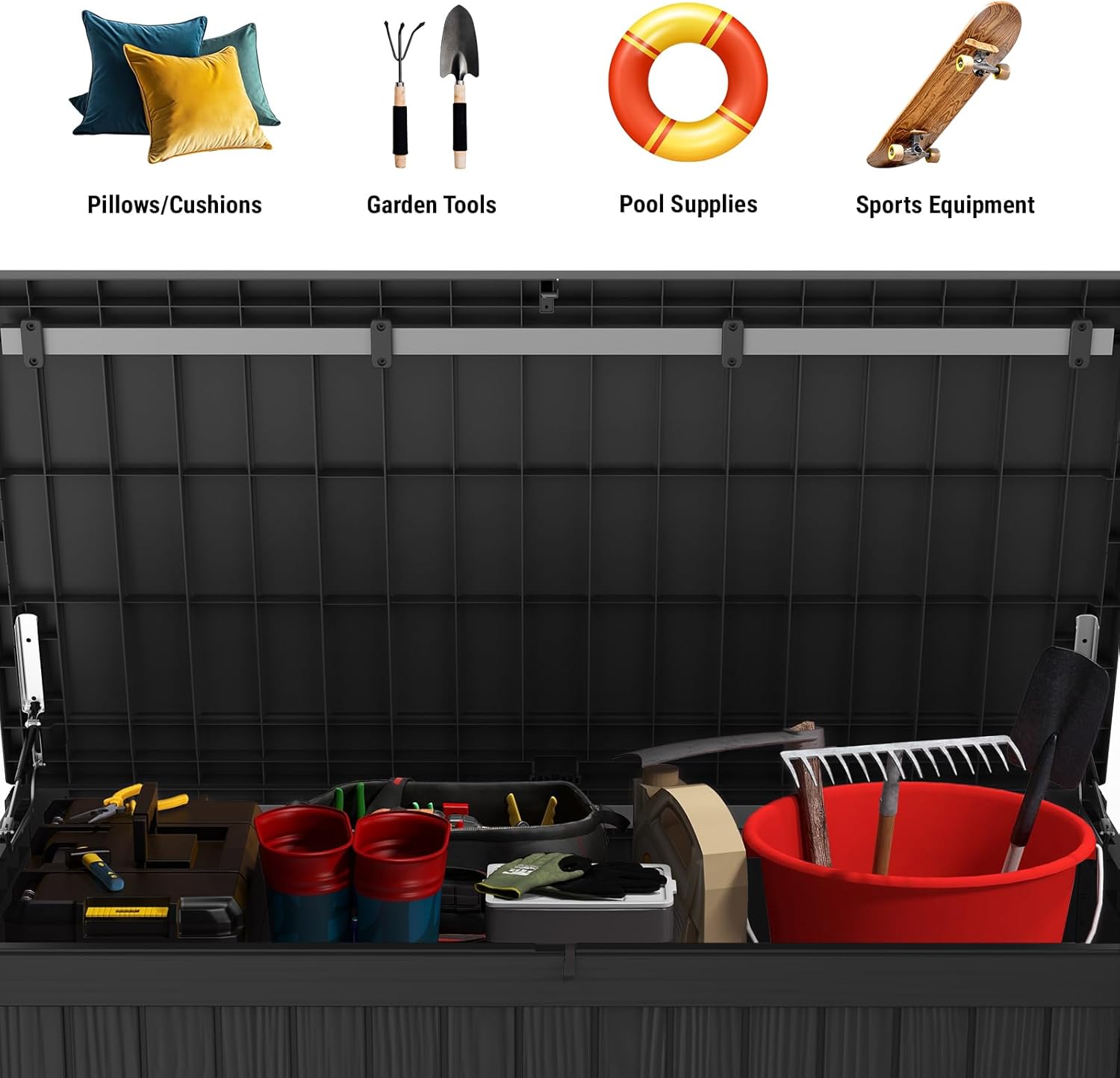 • 【Reinforced Stability】- Engineered with reinforced metal rods for internal supports, this deck box boasts 30% increased strength and resists deformation, doubling as a storage bench, the lid supports up to 800 lbs, providing both storage and seating solutions for your patio