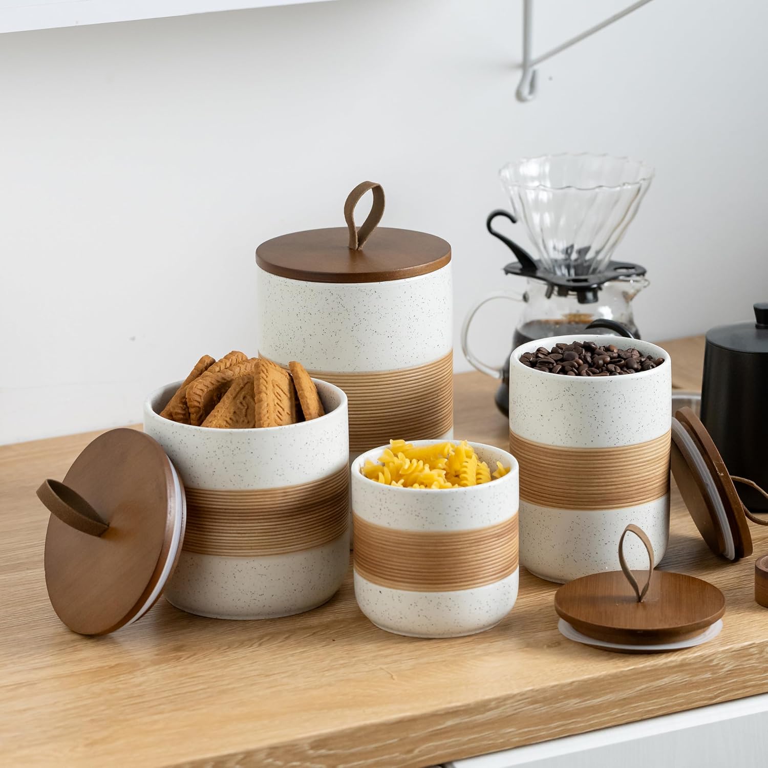 • Rope Cover Design: Each food storage container is equipped with a wooden lid, which has strong sealing and effectively isolates air, moisture, and odors, keeping food dry and fresh, and extending the shelf life of food. There is a unique rope design on the lid, which is easy to open without losing its beauty