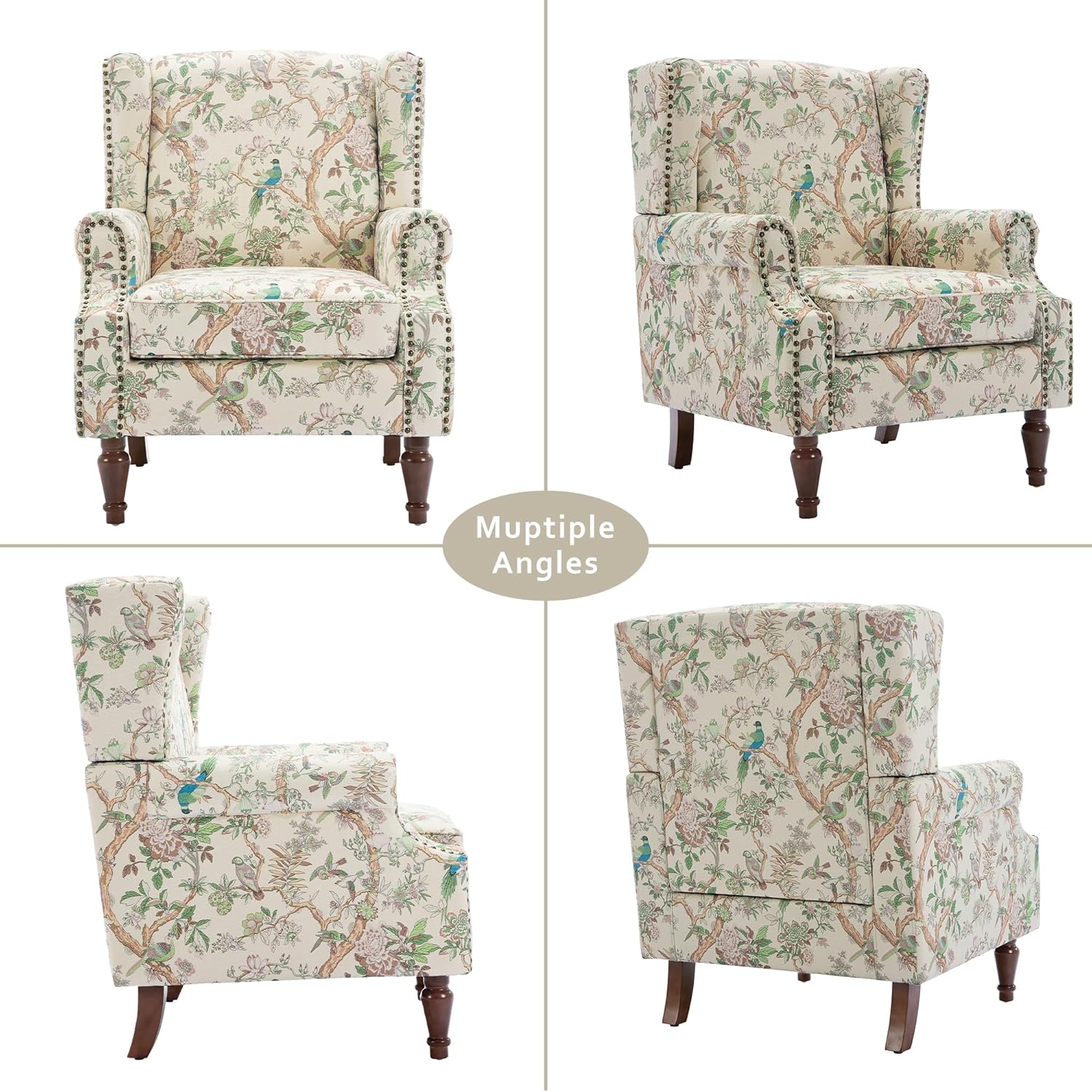 Lumibee Wingback Accent Chair, 2 Set High Back Floral Armchairs in Fabric,Comfy Upholstered Reading Single Sofa Chairs with Solid Wood Legs for Living Room,Bedroom,Office-Bird