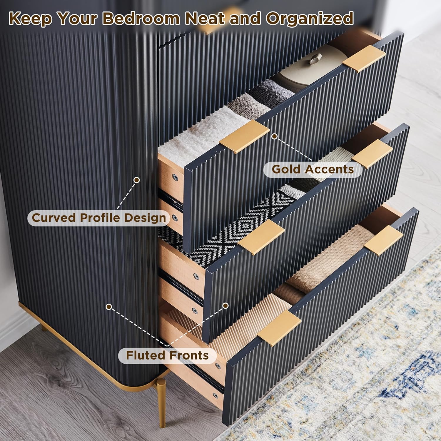 • Elegant Fluted Design: The modern dresser stands out with its fluted fronts on each drawer, adding a touch of sophistication and texture to the overall design. This detail-oriented approach enhances the visual appeal, making it a perfect fit for contemporary and minimalist decors. The fluting not only serves as an aesthetic feature but also subtly hides fingerprints and minor scratches, maintaining the dresser's pristine appearance over time.