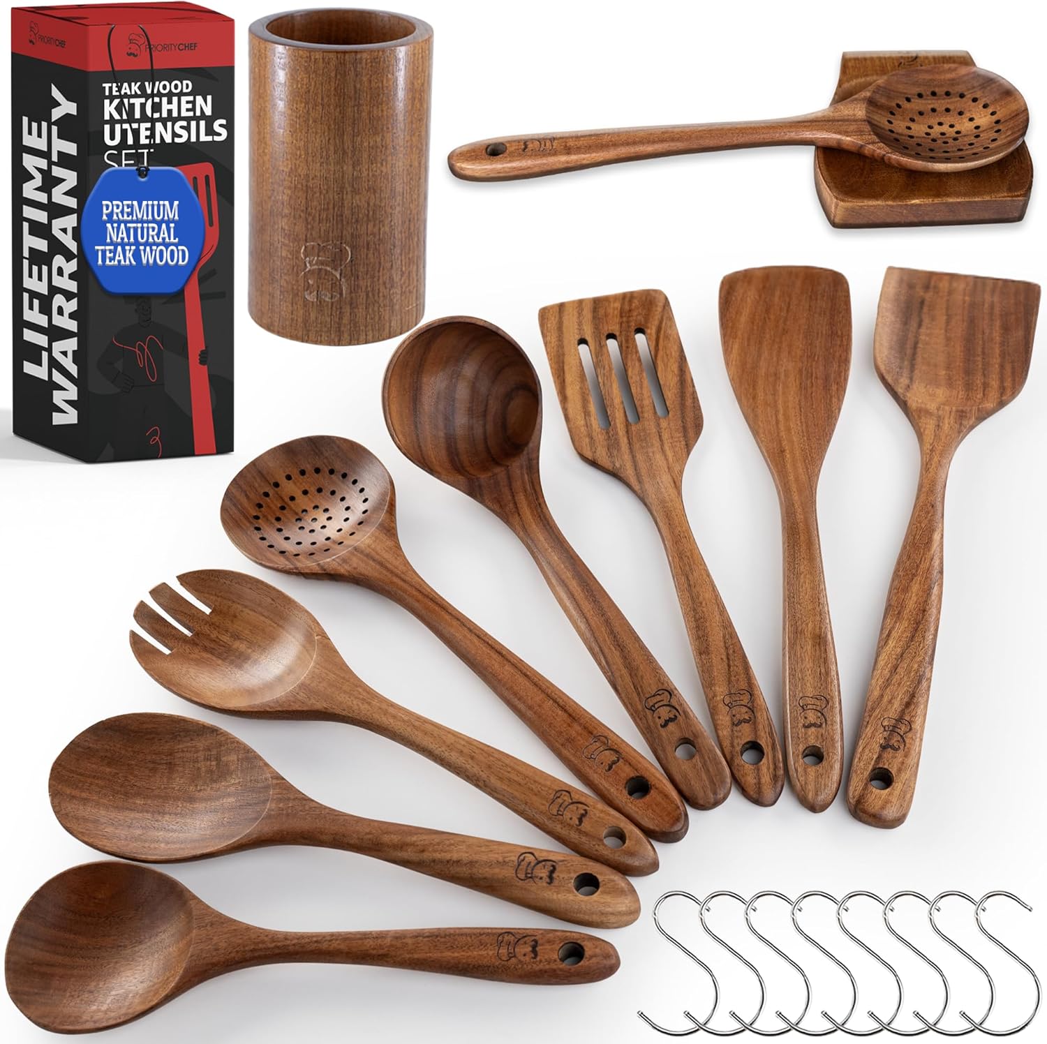 • Built Tough, Made to Look Good - Durable enough for daily meals, good-looking enough for guests. This teak wooden kitchen utensils set holds up to heat, moisture, and constant use - while still looking clean and classic every time you grab it.