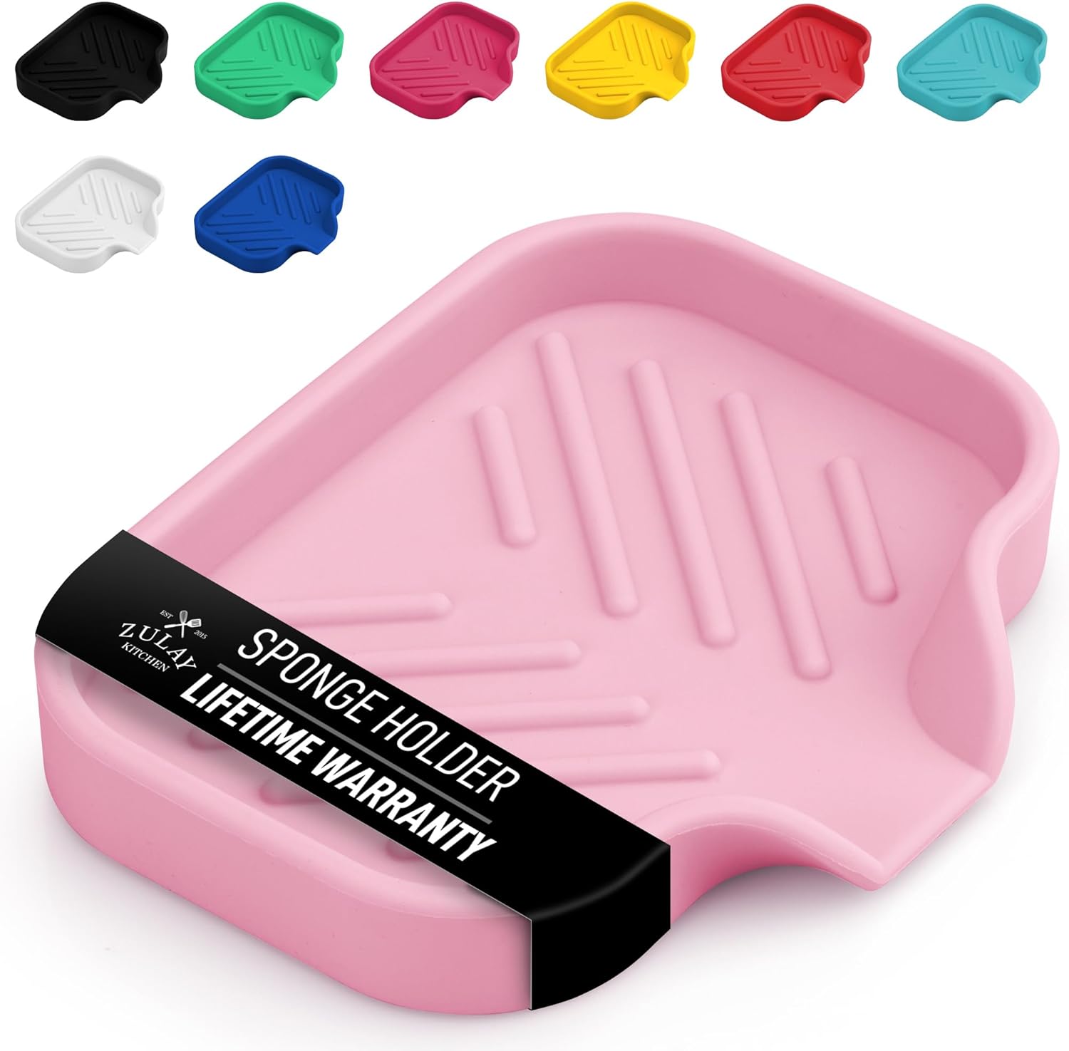 Zulay Kitchen Small Silicone Sponge Holder (4.9x3.3”) – Space-Saving Sink Organizer Tray for Sponge, Soap, Brush & More – Compact Non-Slip Dish for Kitchen & Bathroom (Pink)