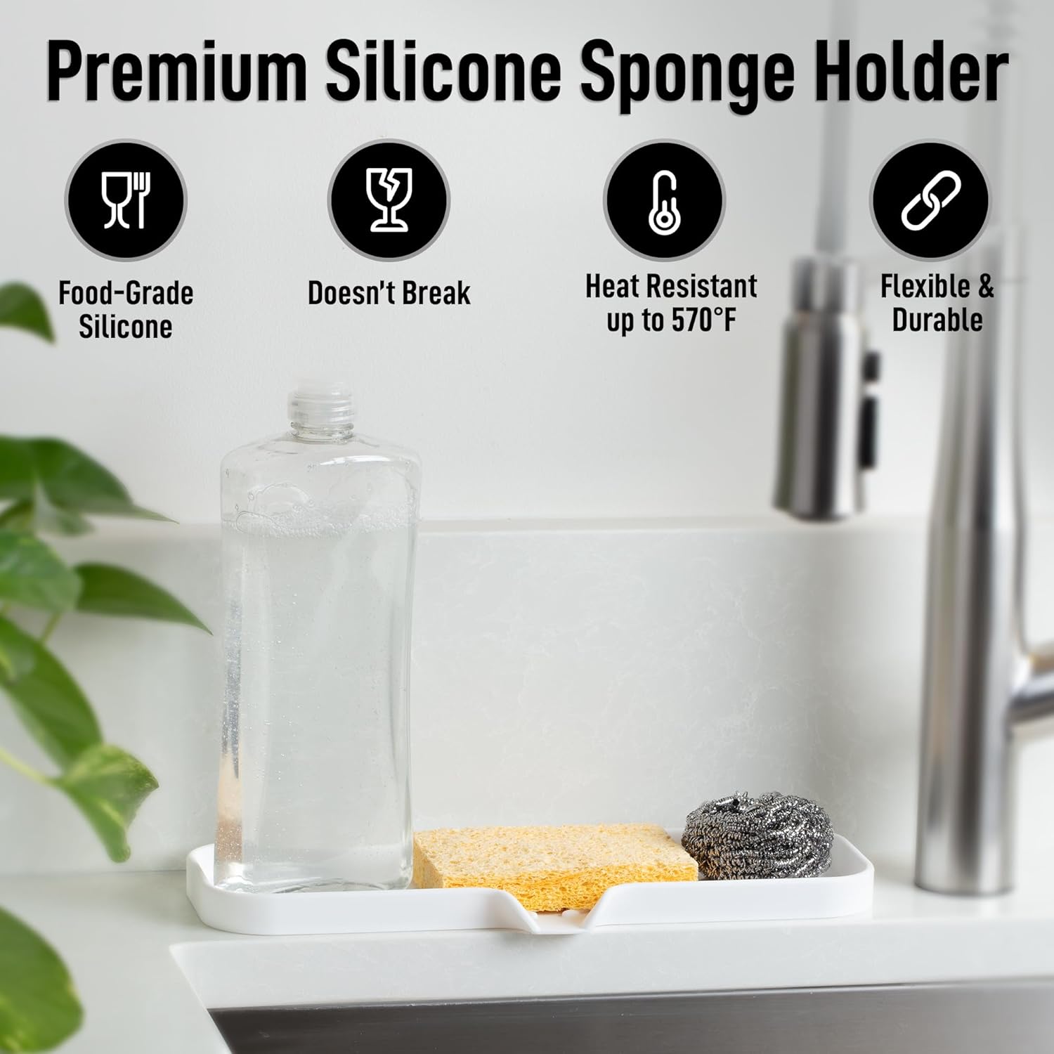 • MESS-FREE KITCHEN: Effortlessly keep your sink and countertops clean and organized with our large silicone sponge holder. Measuring 12 x 4 inches, this spacious tray is perfect for holding multiple cleaning sponges, scrub brushes, dish soap bottles, hand soap bars, silverware, and more. Its versatile size also makes it ideal for use in utility rooms, bathrooms, laundry areas, or on your vanity to store makeup and small accessories.