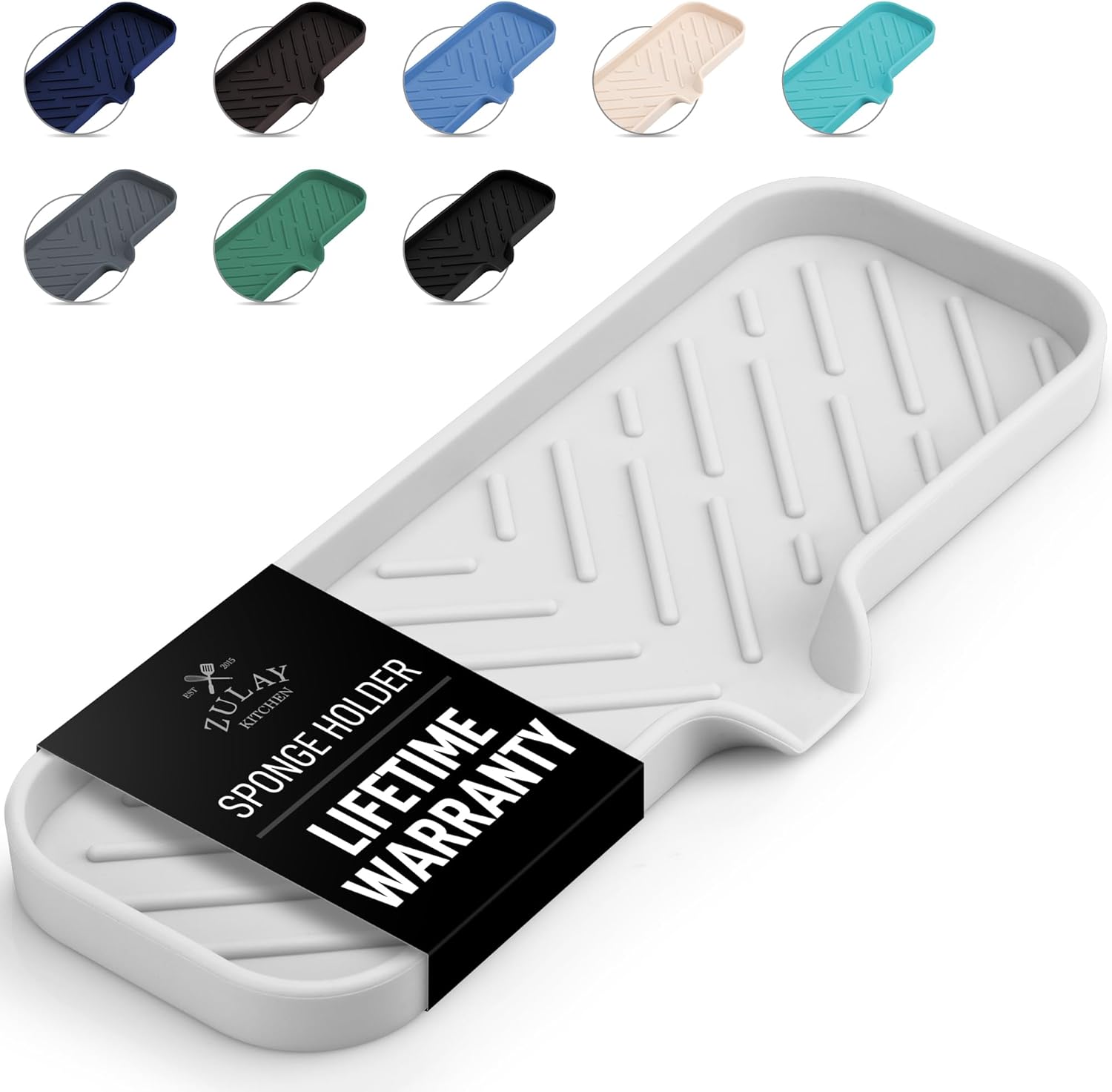 Zulay Kitchen Large Silicone Sponge Holder (12x4) – Flexible Sink Organizer Tray for Kitchen & Bathroom – Multipurpose Soap Dish for Sponges, Makeup, Trinkets & More (White)