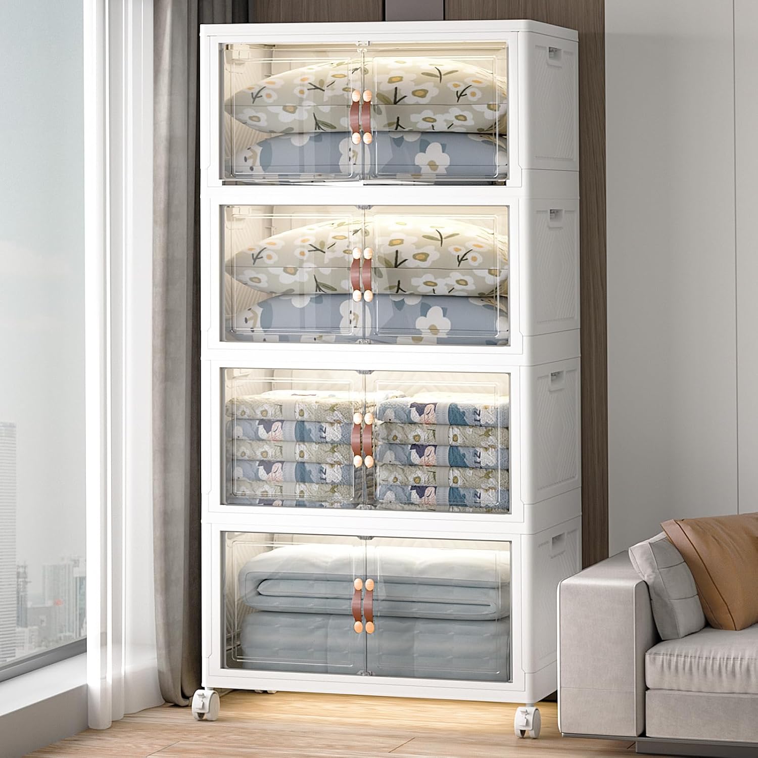 Extra Large Stackable Storage Bins with Lids & Wheels & Door, 640QT-160QT/40GAL*4Pack Foldable Collapsible Closet Organizers, Plastic Containers Drawers for Bedroom Dorm Garage Sturdy MAX