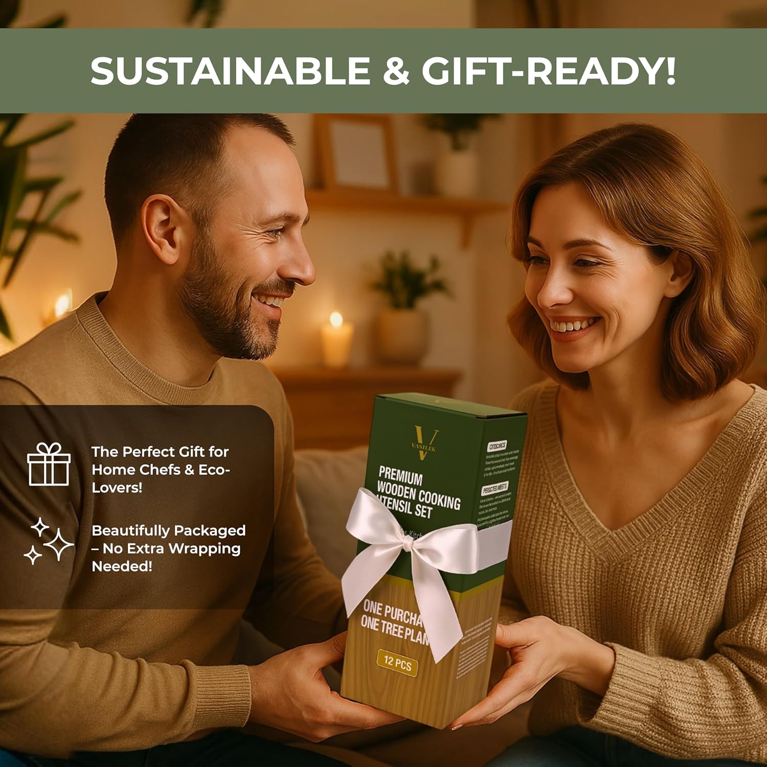 Vasilek Wooden Cooking Utensils Set – 12-Piece Acacia Wood Kitchen Utensil Set with Square Holder & Spoon Rest, Non Toxic Wooden Tools for Nonstick Cookware, Spatula, Ladle, Serving Spoon