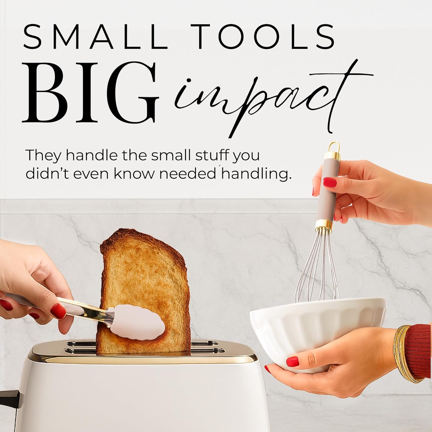 • BEIGE AND GOLD, A STYLED STATEMENT: Elevate your gold kitchen decor with chic beige silicone and lustrous gold kitchen utensils. Designed to complement white and gold kitchen appliances and accessories, this gold utensils set doubles as functional art for your countertop.