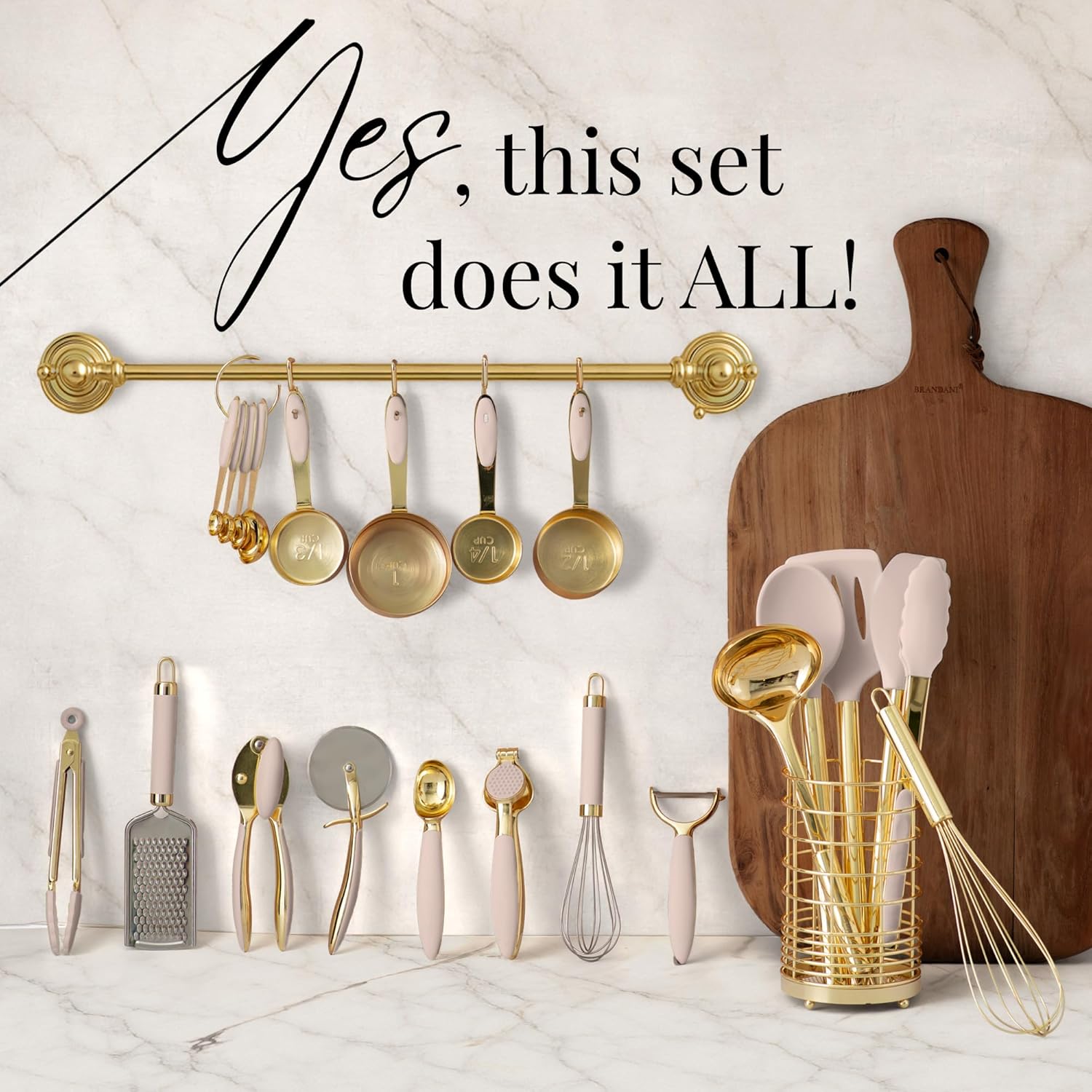 • 23 GOLD KITCHEN TOOLS, PERFECTLY COORDINATED: This complete 23-piece gold cooking utensils set includes a gold whisk, gold ladle, gold spatula, silicone slotted spatula, gold spoon, tongs, garlic press, cheese grater, gold can opener, gold pizza cutter, gold ice cream scoop, mini gold tongs and whisk, gold utensil holder, and a full gold measuring cups and spoons set. Your beige kitchen accessories have never looked so luxurious—or complete.