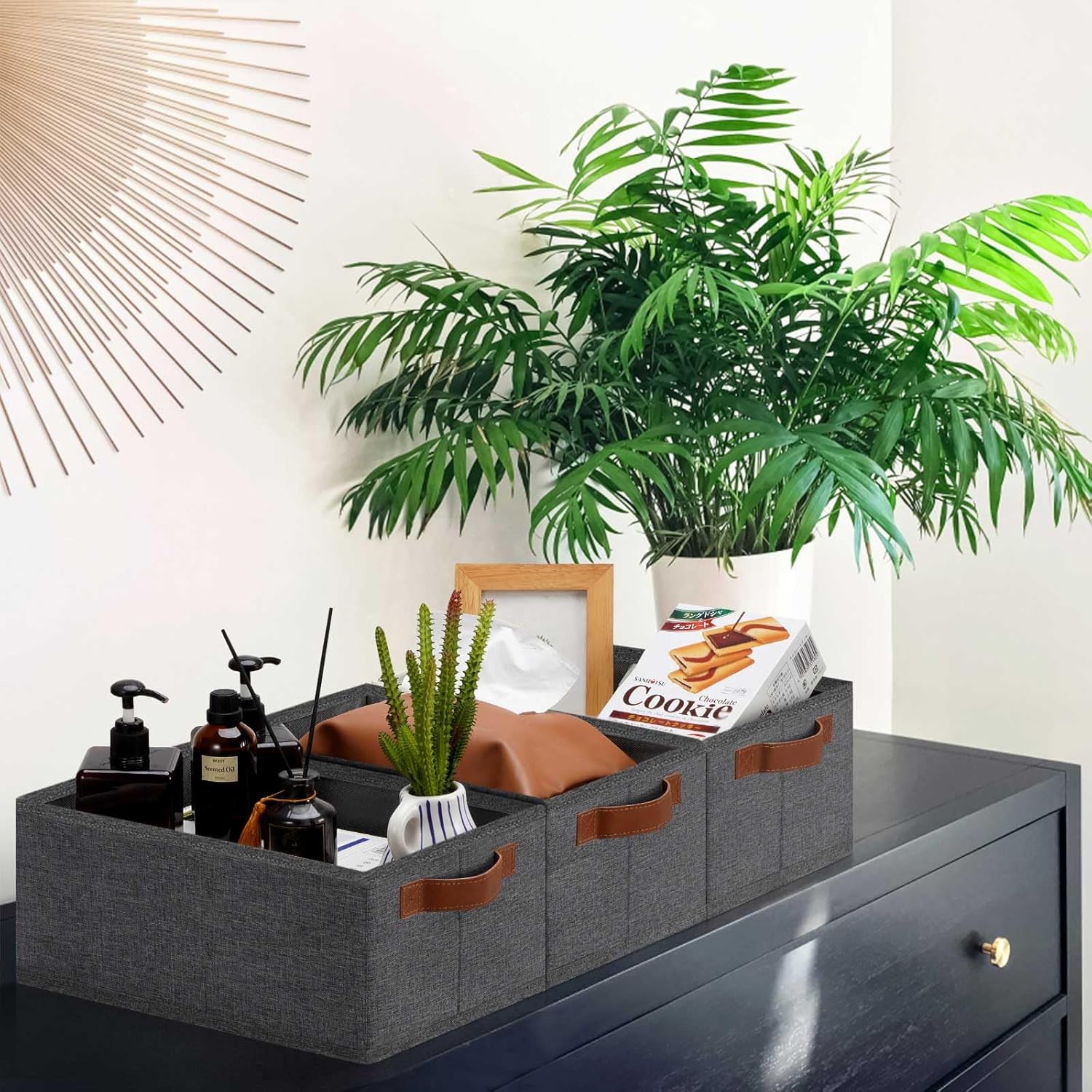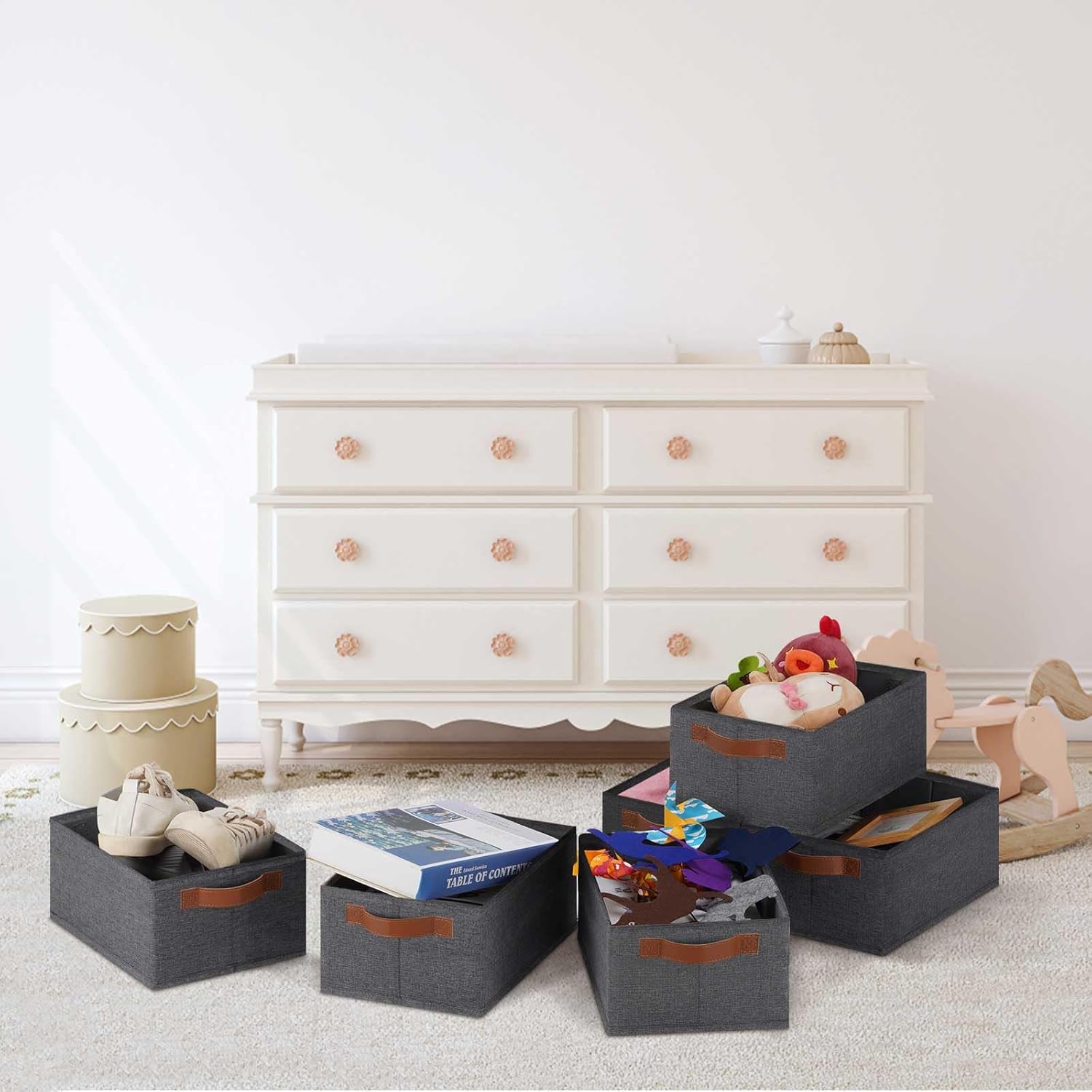• 👍【QUALITY MATERIAL】Storage baskets for shelves are made of high-quality cationic fabric and polyester cotton fabric, and the inner layer is made of non-woven fabric, which is odorless, long-lasting and strong. Classic faux leather handles that adds a comfortable touch and provides a strong and comfort grip to pull and move. Fabric storage bin is easy to clean, just wipe with a damp sponge or cloth.