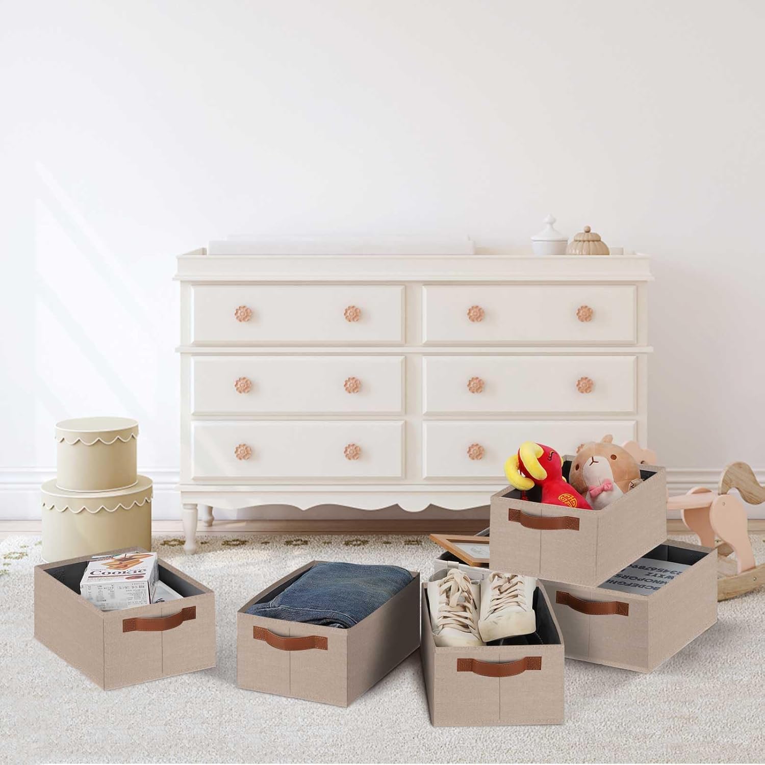 • 👍【QUALITY MATERIAL】Storage baskets for shelves are made of high-quality cationic fabric and polyester cotton fabric, and the inner layer is made of non-woven fabric, which is odorless, long-lasting and strong. Classic faux leather handles that adds a comfortable touch and provides a strong and comfort grip to pull and move. Fabric storage bin is easy to clean, just wipe with a damp sponge or cloth.