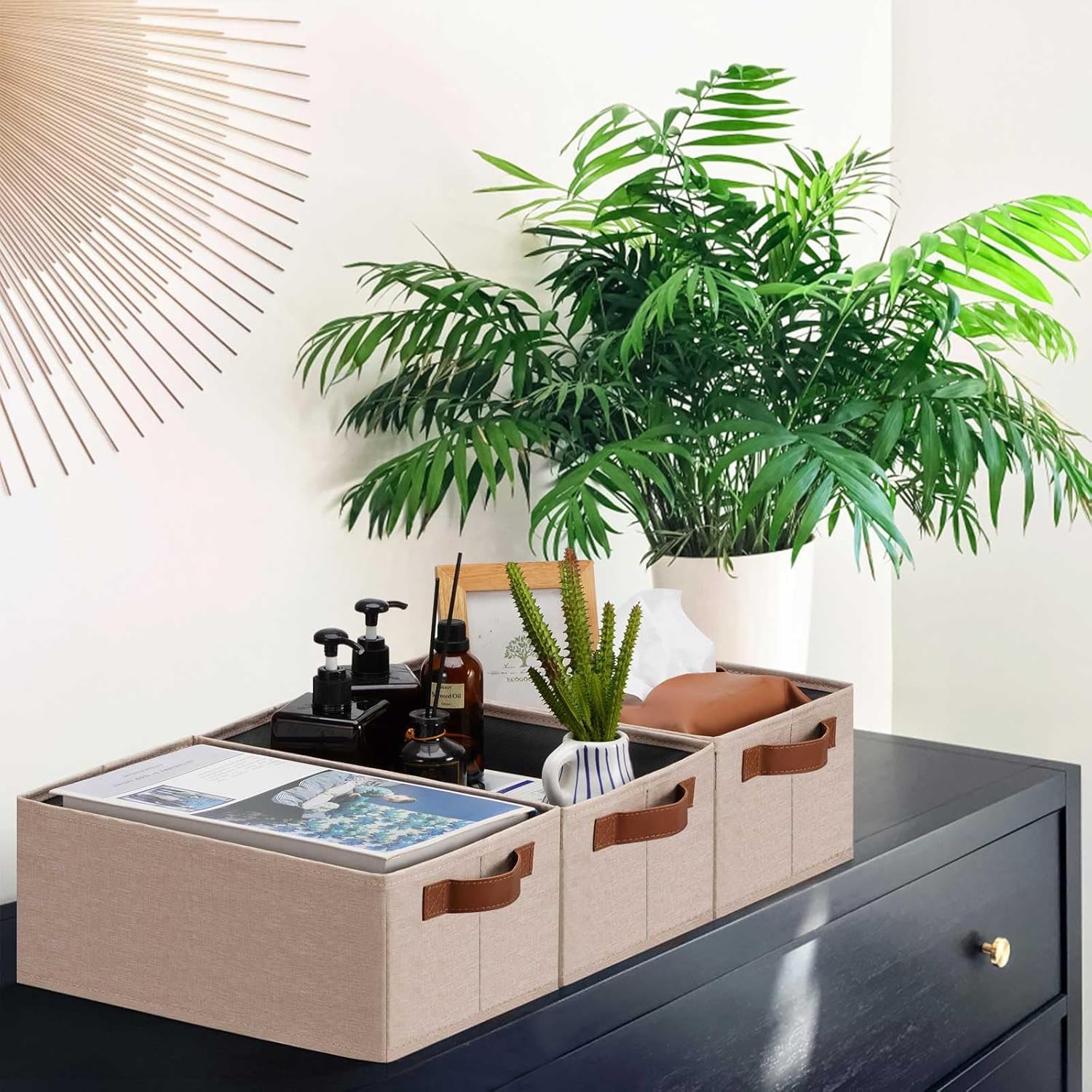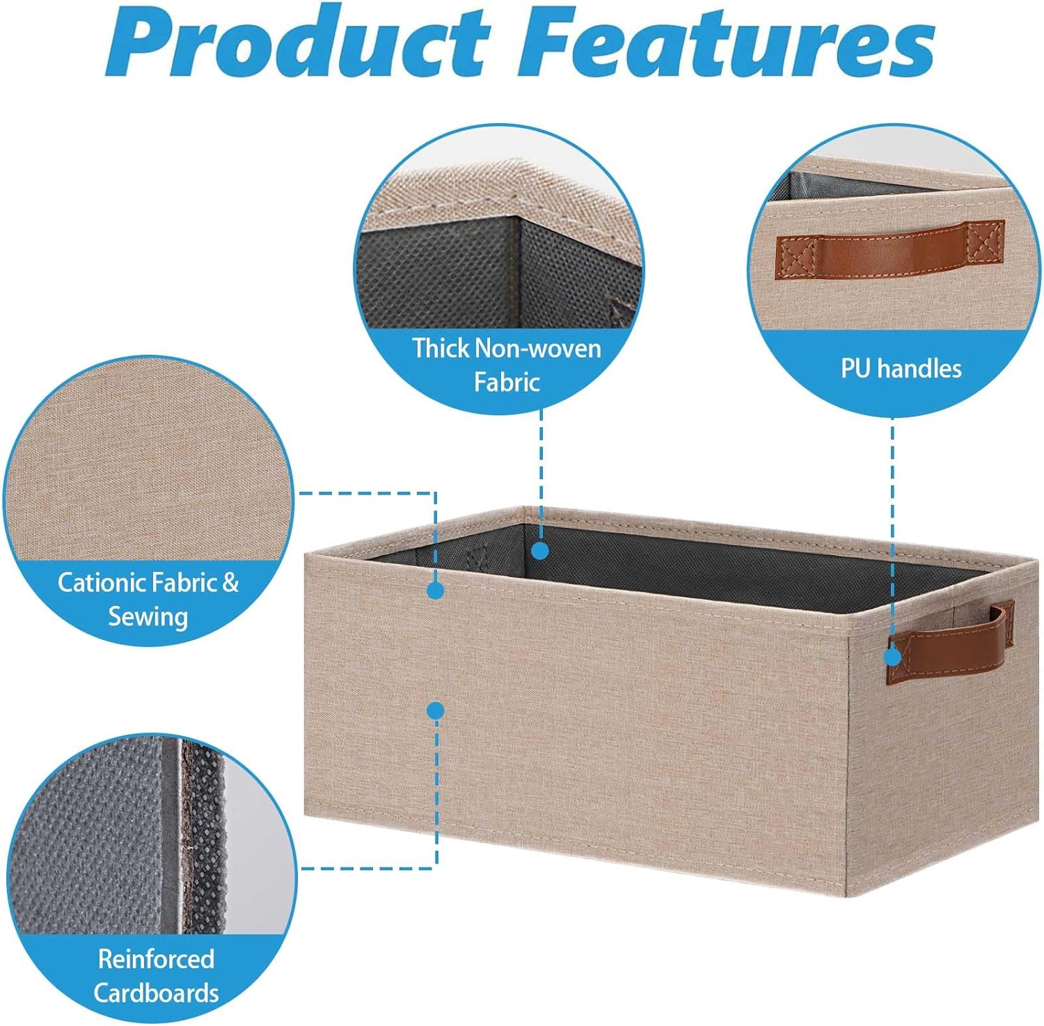 • 👍【QUALITY MATERIAL】Storage baskets for shelves are made of high-quality cationic fabric and polyester cotton fabric, and the inner layer is made of non-woven fabric, which is odorless, long-lasting and strong. Classic faux leather handles that adds a comfortable touch and provides a strong and comfort grip to pull and move. Fabric storage bin is easy to clean, just wipe with a damp sponge or cloth