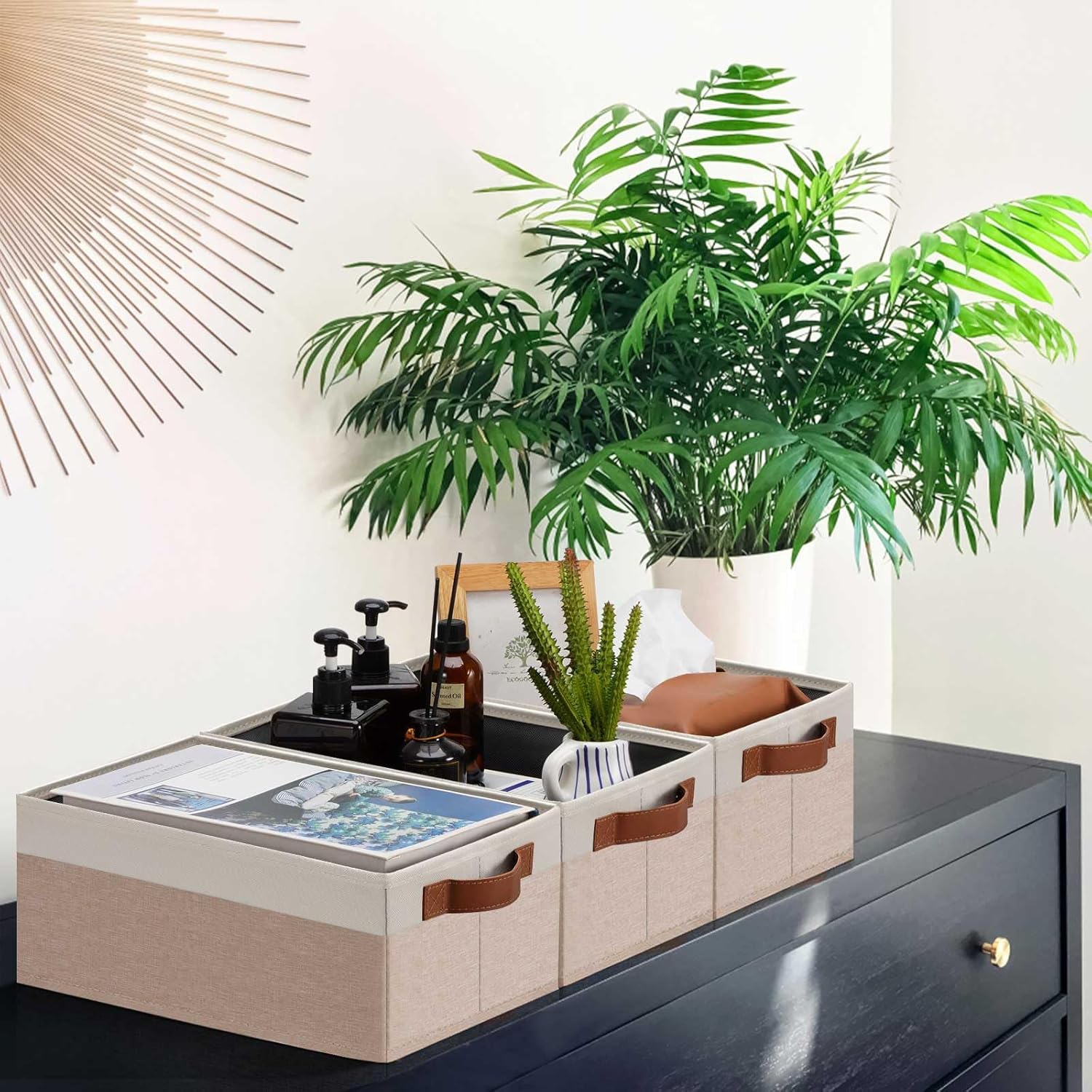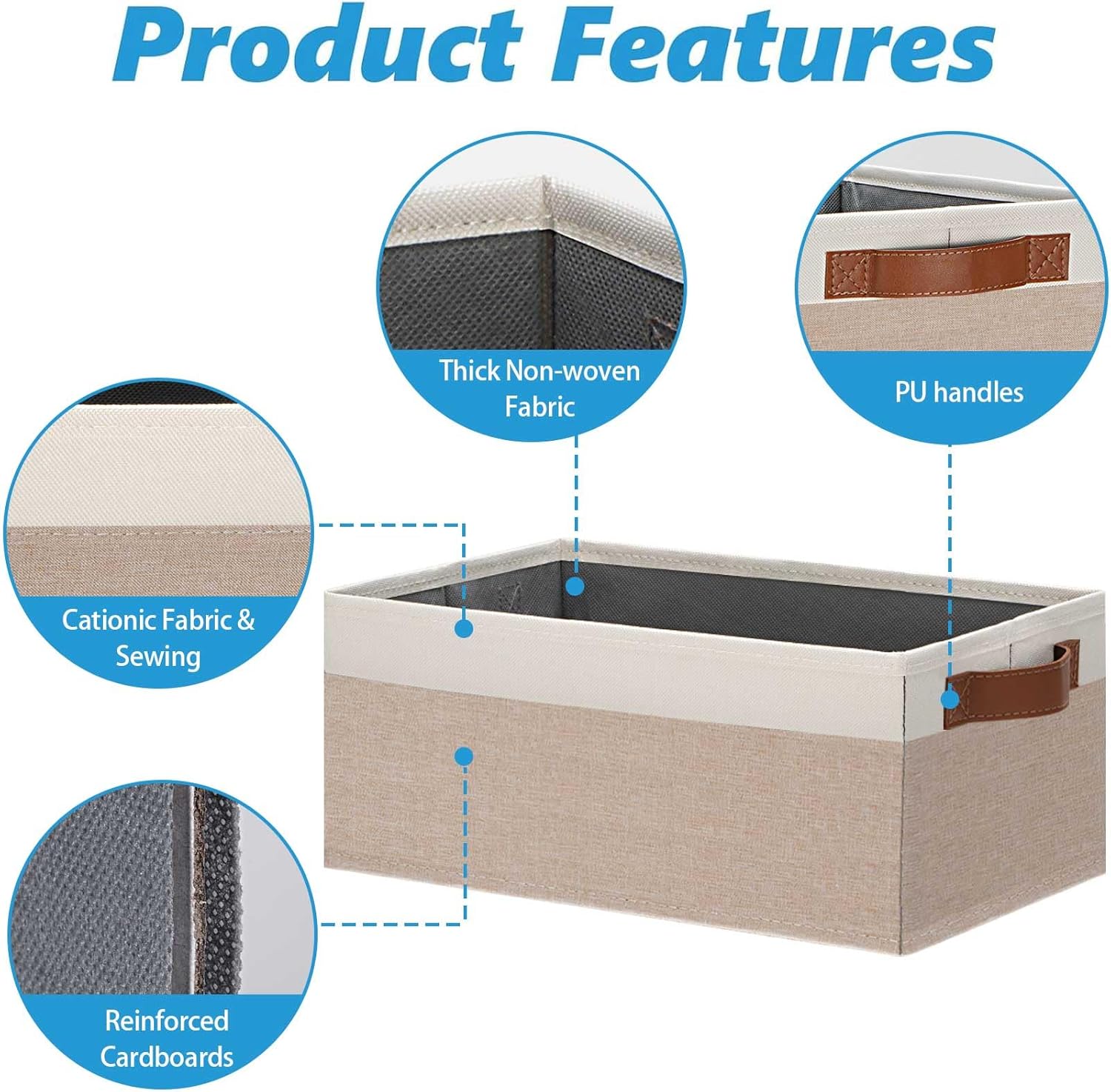 • 👍【QUALITY MATERIAL】Storage baskets for shelves are made of high-quality cationic fabric and polyester cotton fabric, and the inner layer is made of non-woven fabric, which is odorless, long-lasting and strong. Classic faux leather handles that adds a comfortable touch and provides a strong and comfort grip to pull and move. Fabric storage bin is easy to clean, just wipe with a damp sponge or cloth
