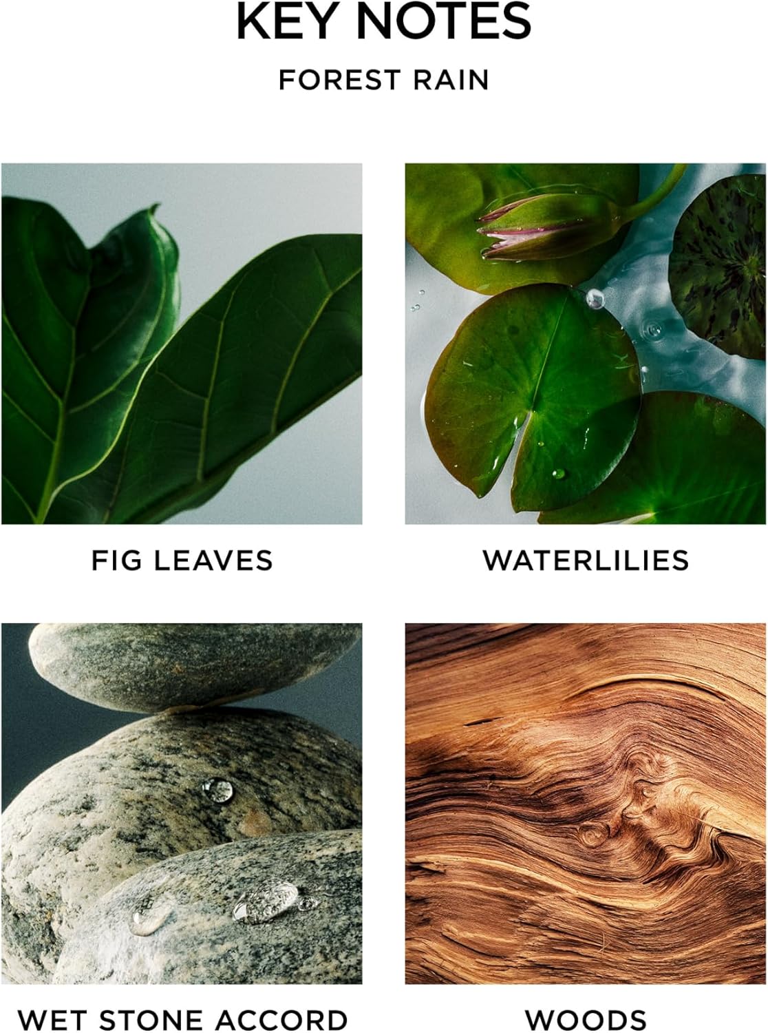 • FRESH - Dewy fig leaves wrapped in an aquatic veil of waterlilies evoke the cleansing feeling of a lush green forest in a downpour. Grounded in earthy woods and cooling wet stones, this scent encapsulates the transformative essence of rain.
