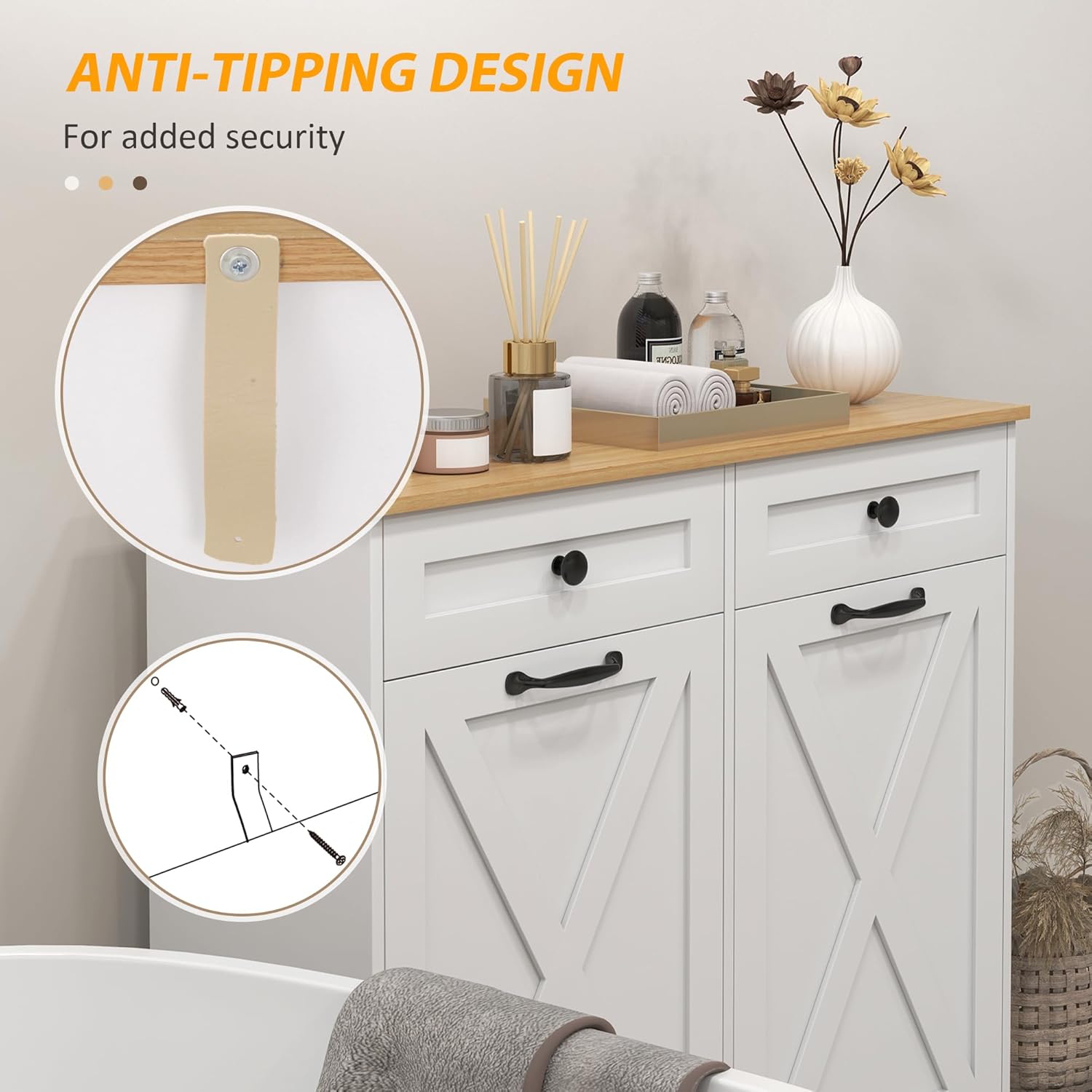 HOMCOM Tilt Out Laundry Hamper Cabinet with 2 Removable Baskets, Freestanding Bathroom Storage Cabinet with 2 Drawers, Trash Can Cabinet for Living Room, Laundry Room, White