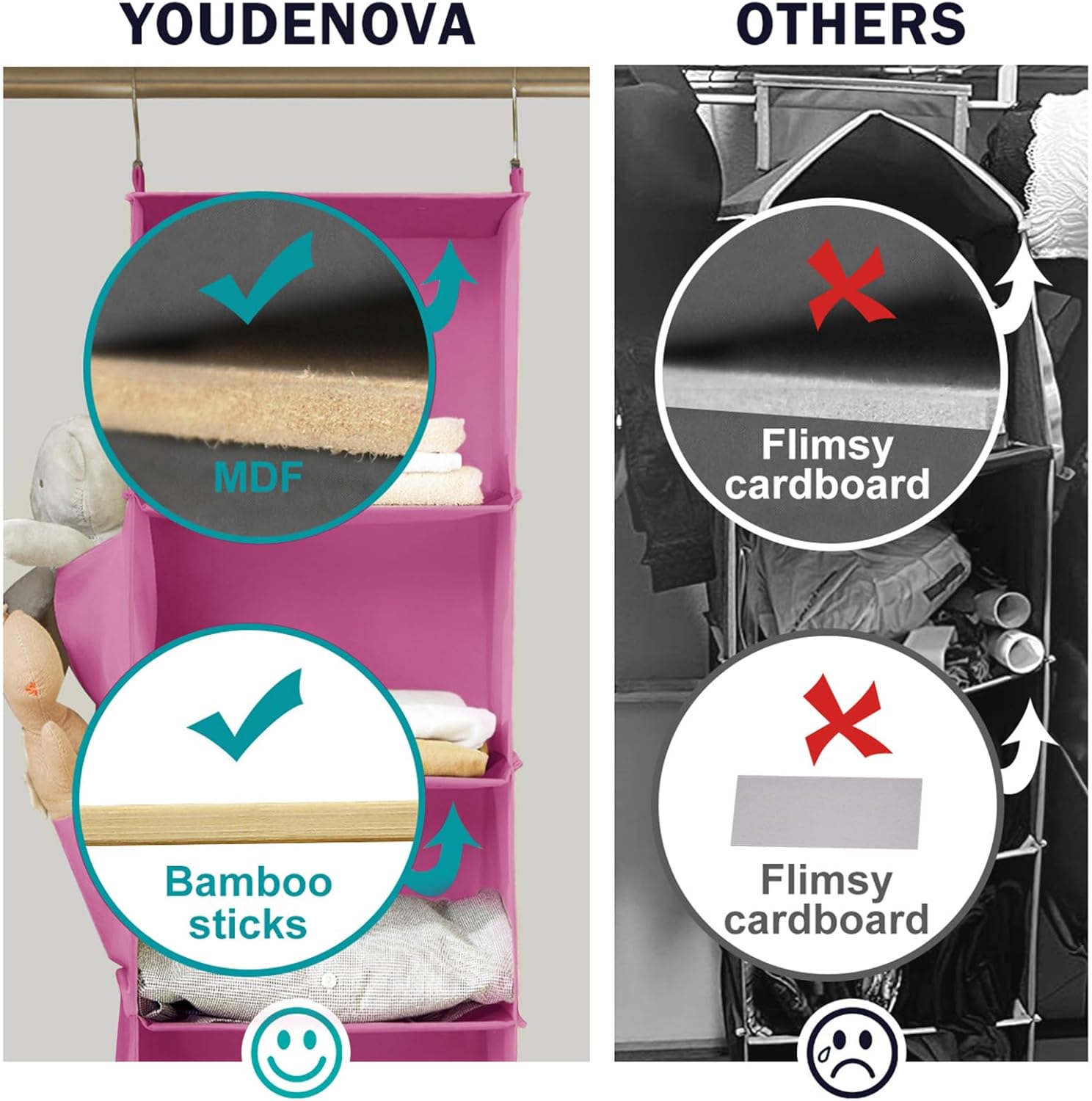 • High Quality: Our hanging closet organizer is crafted from sturdy and thick non-woven fabric, ensuring long-lasting use. Unlike similar products, it features 2 sturdy bamboo sticks at each shelf and MDF board at the top and bottom, effectively preventing the compartments from bending