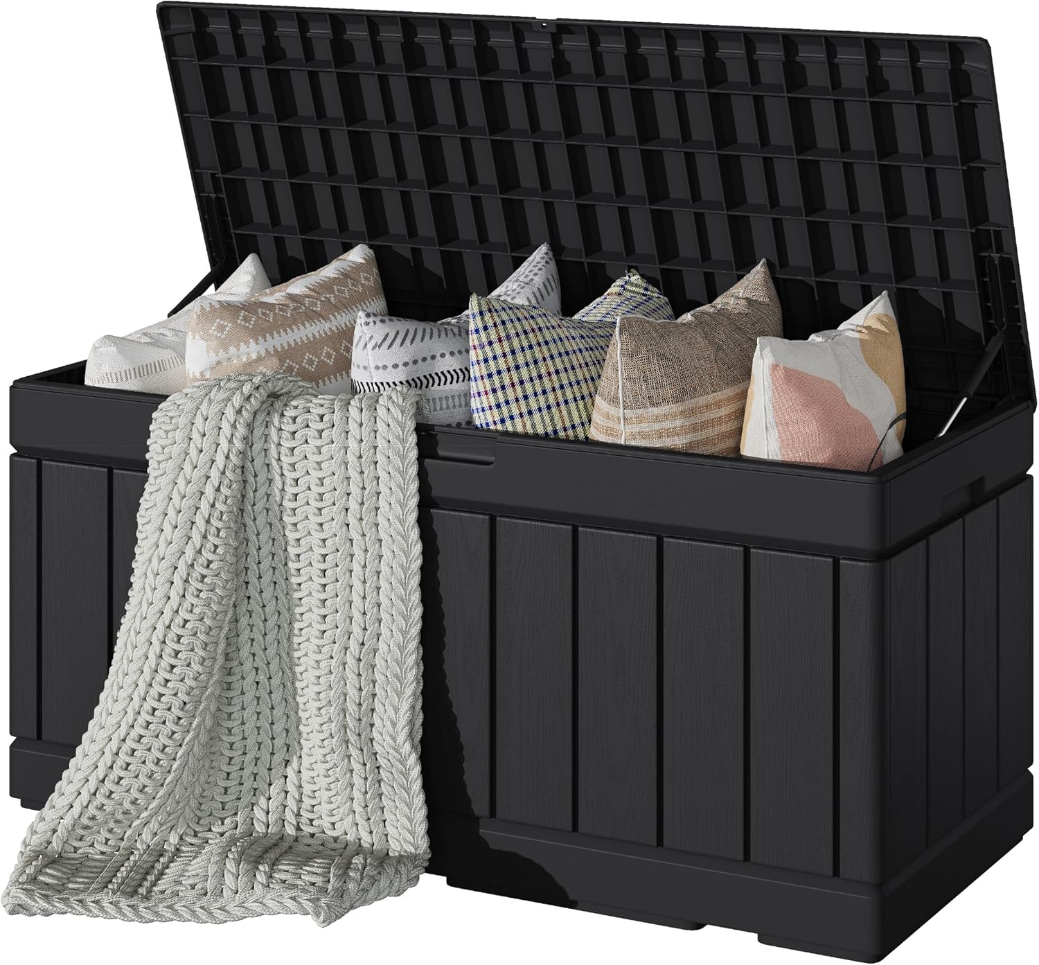 • Resistant Resin Material: Deck box is made of waterproof resin, with a complementing rattan pattern design, effectively preventing fading and rusting, while also maintaining a fresh appearance even with all-weather use