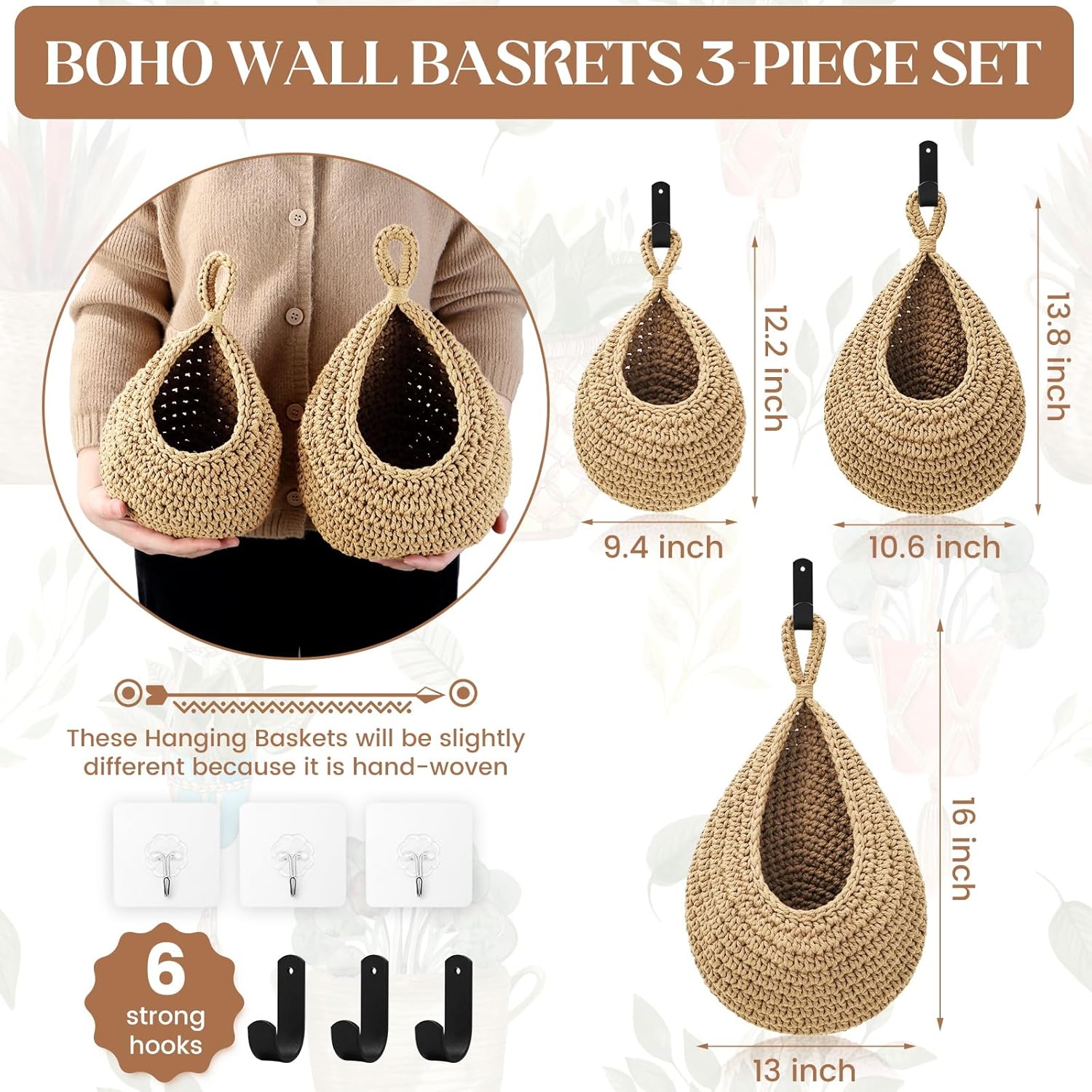 • 【Storage Basket Set】 - You will receive 3 different Boho wall baskets with 6 hanging hooks go together in a complete collection. Our hanging fruit basket wall decor offers a cohesive look when grouped together. Scattered around, these hanging wall basket create a customized arrangement. Save your home space, make your home more beautiful and your life more organized.