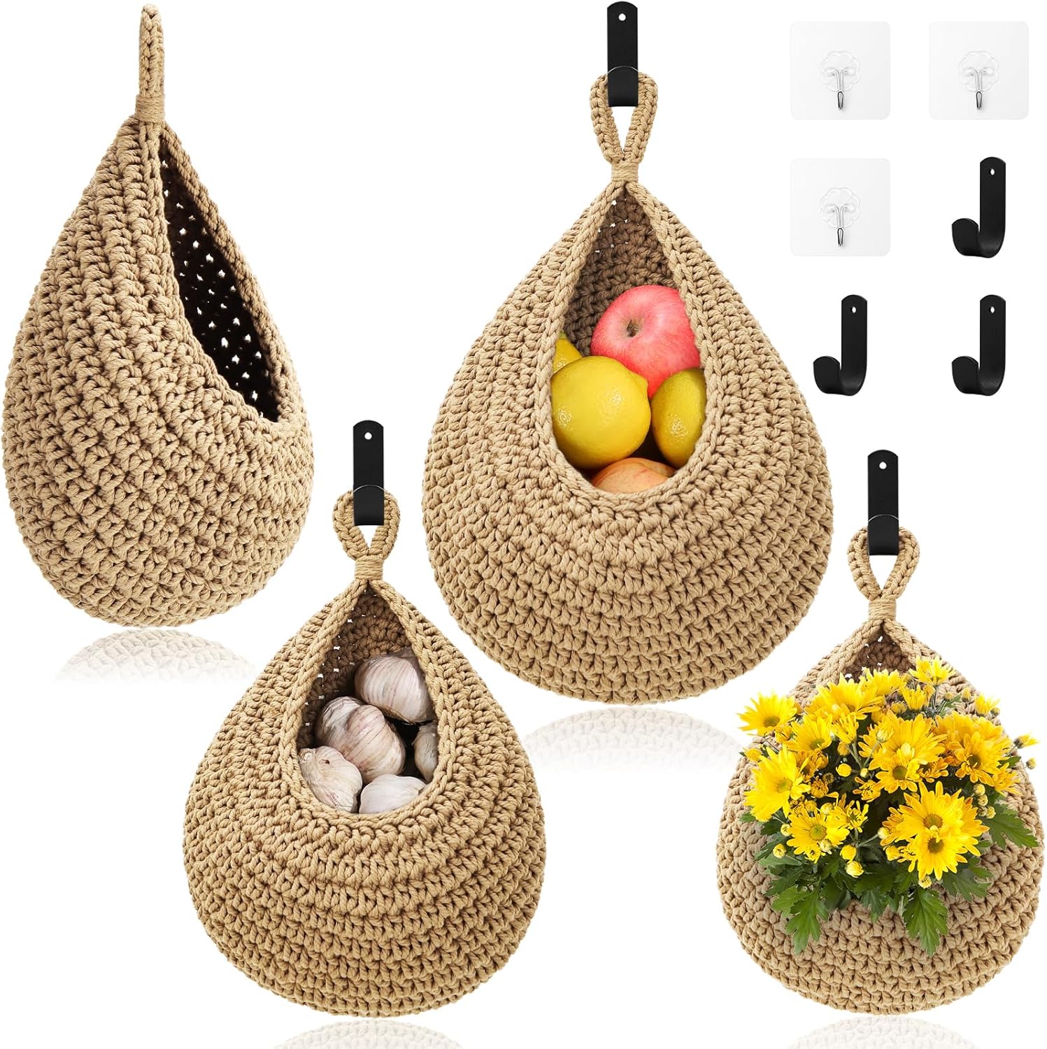 Wall Hanging Baskets for Organizing - 3 Pack Hanging Fruit Basket with 6 Pcs Strong Hooks, Handwoven Onion Storage Teardrop Home Onion Basket for Fruits Vegetable Potato Kitchen Storage(Light Linen)