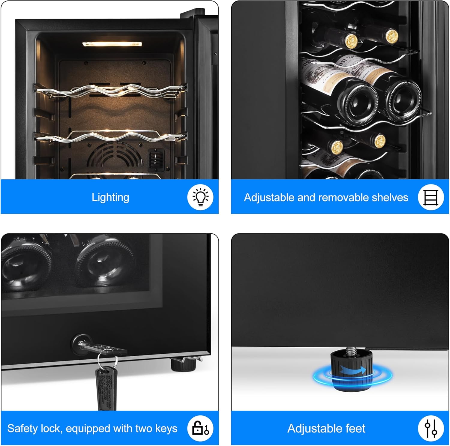 • 12 Bottles Capacity: The wine fridge can store 12 standard wine bottles; The wine cooler has 5 removable shelves that are easy to access and organize your wine