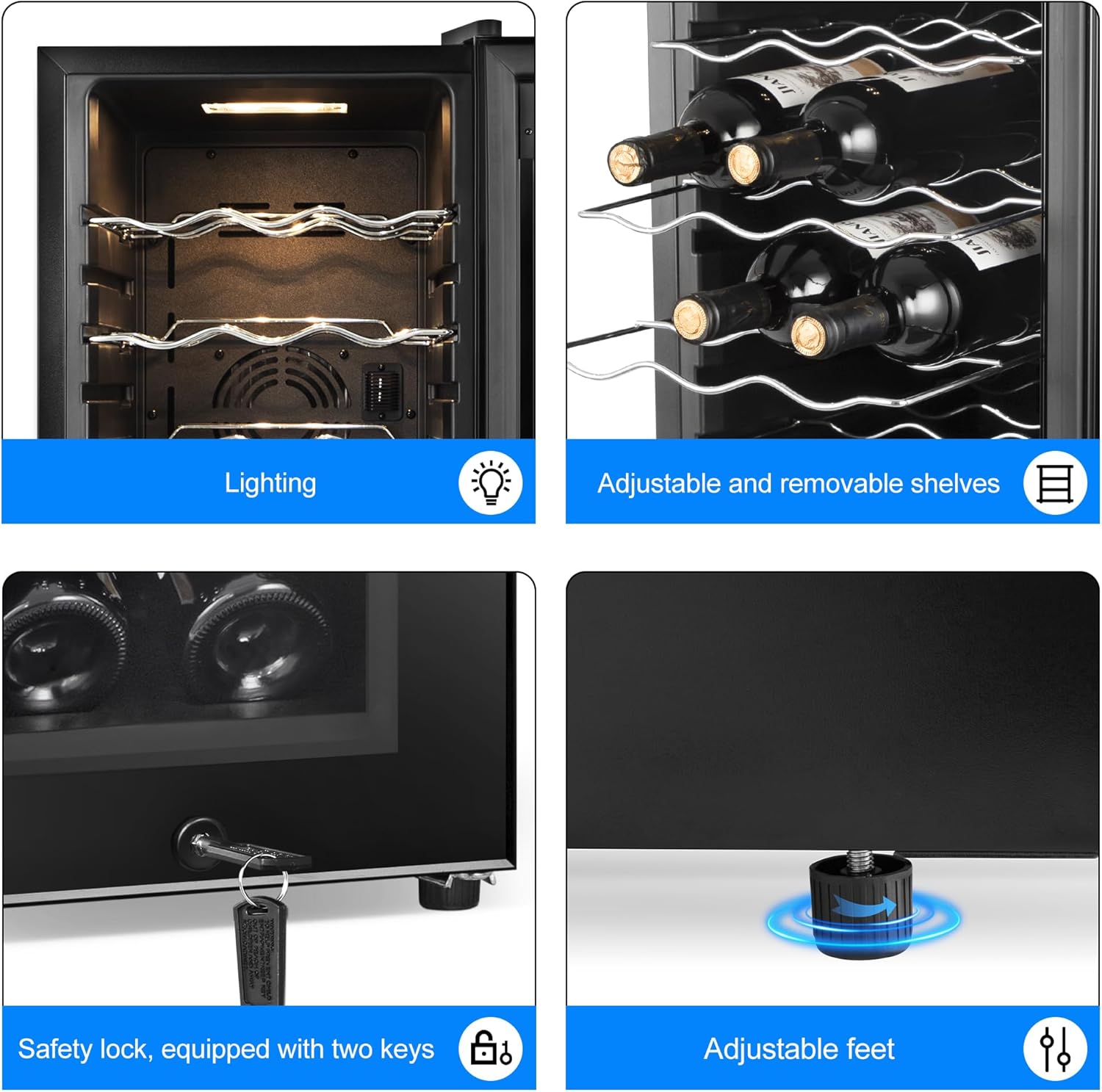 • Wide Applications: The 13.6-inch wide mini wine refrigerator is fashionable, classic, and space-saving; Suitable for home, office, dormitory, RV, and so on