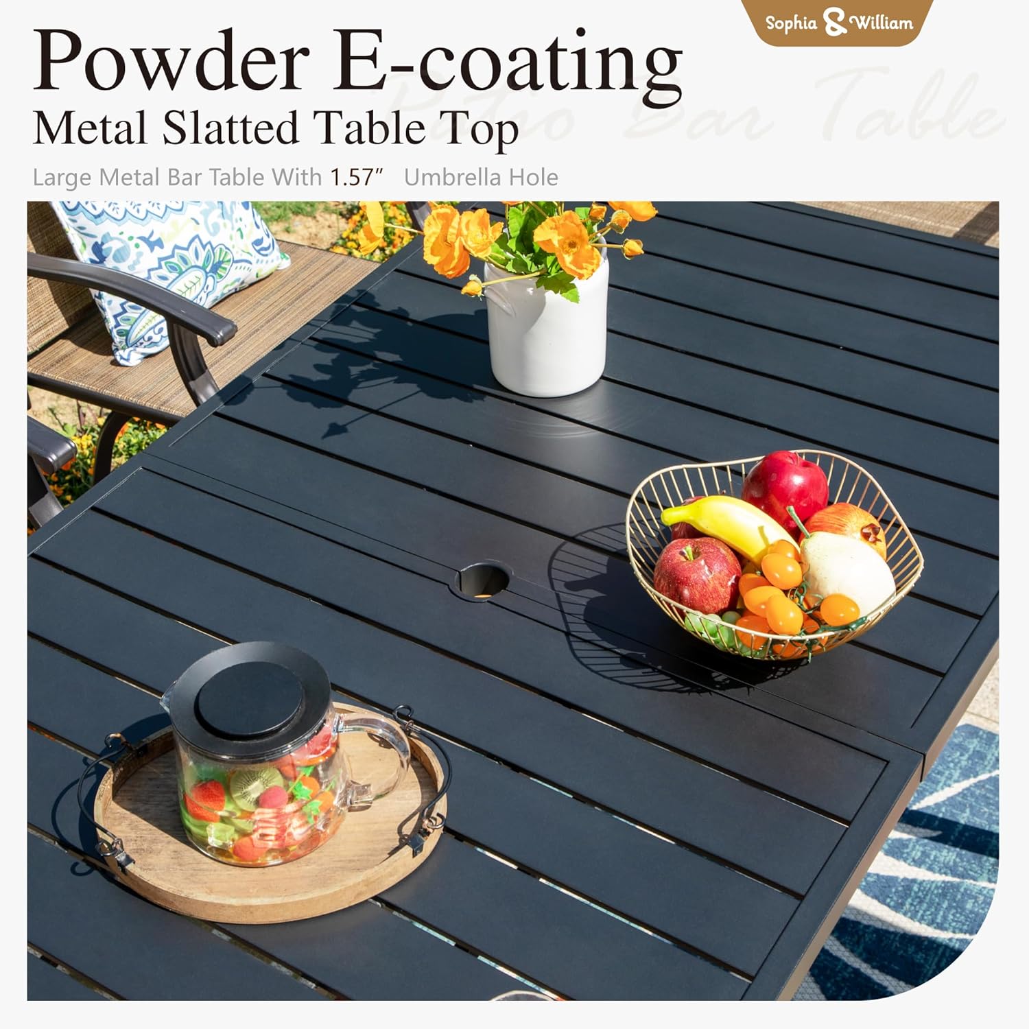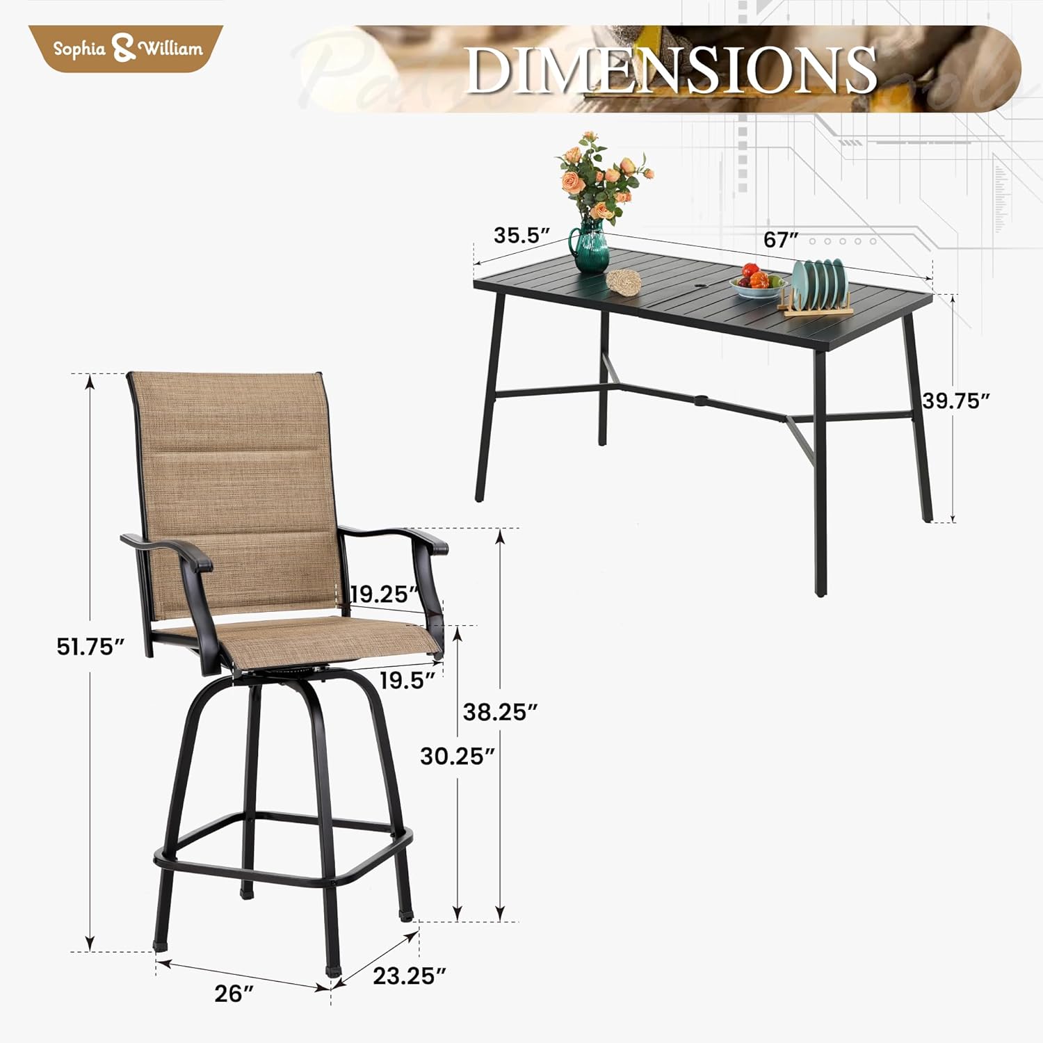 • Barheight Patio Table and Chairs:Combines ergonomic high back design with seamless swivel functionality, this bar set provides a stylish and elevated seating option that adds flair to any space. Patio bar table features a classic and neat tabletop with 1.57 umbrella hole
