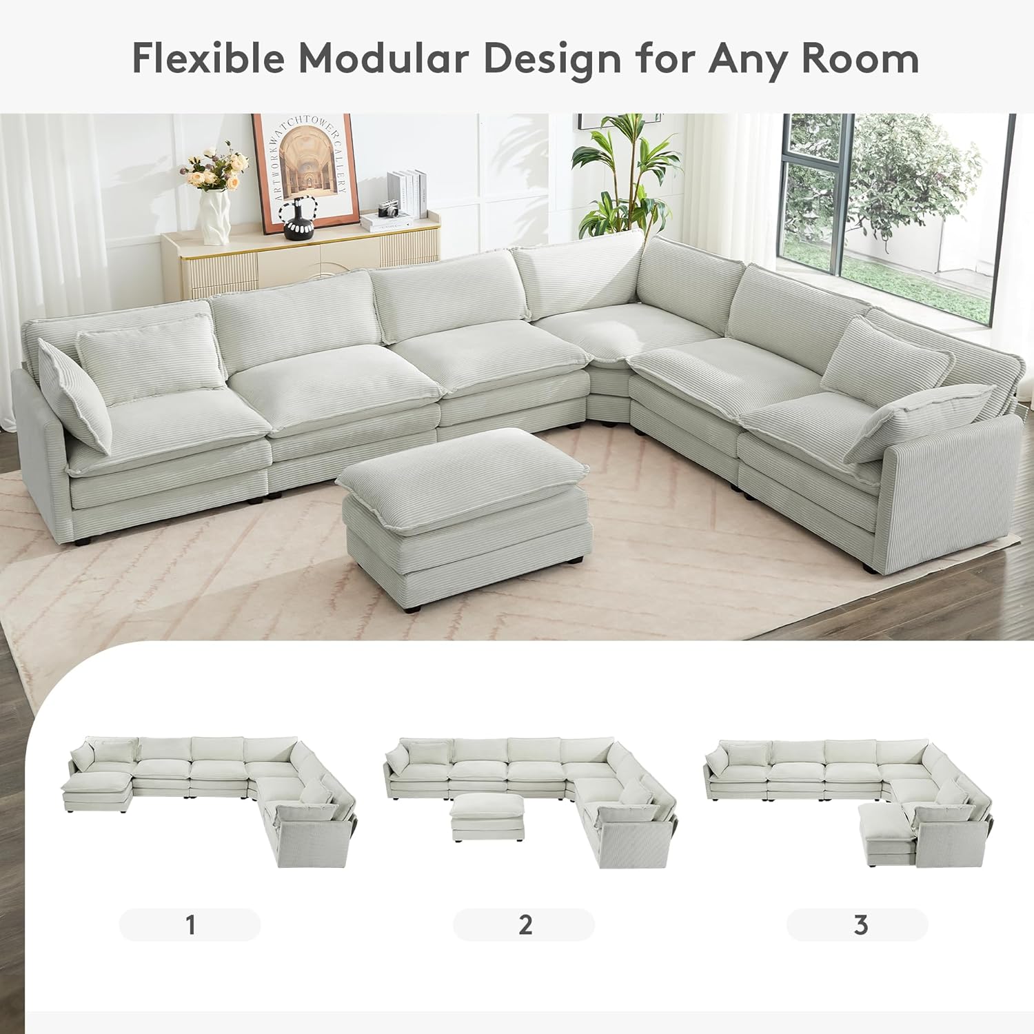 ROWHY 150'' Modular Sectional Sofa Cloud Couch, 7 Seater Big Comfy Corduroy L Shaped Couch with 4 Pillows, Chaise, Ottoman, Deep Seat Sectional Couches for Living Room Office, Light Grey