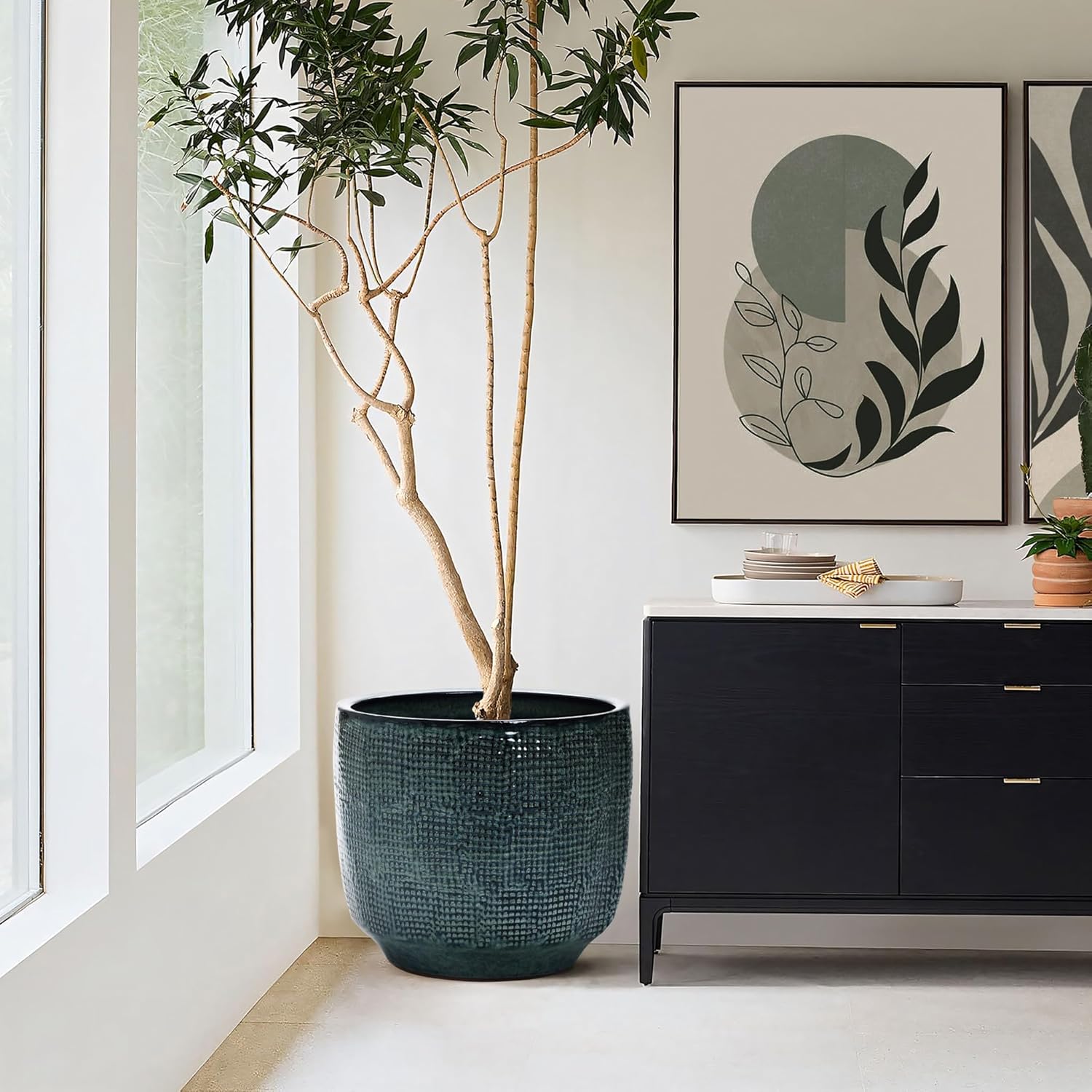 LuxenHome 15.5" Dia Large Ceramic Pots for Plants, Modern Green Glazed Planters for Outdoor Plants, Round Indoor Flower Pots with Drainage Hole and Rubber Plug for Home Garden Patio
