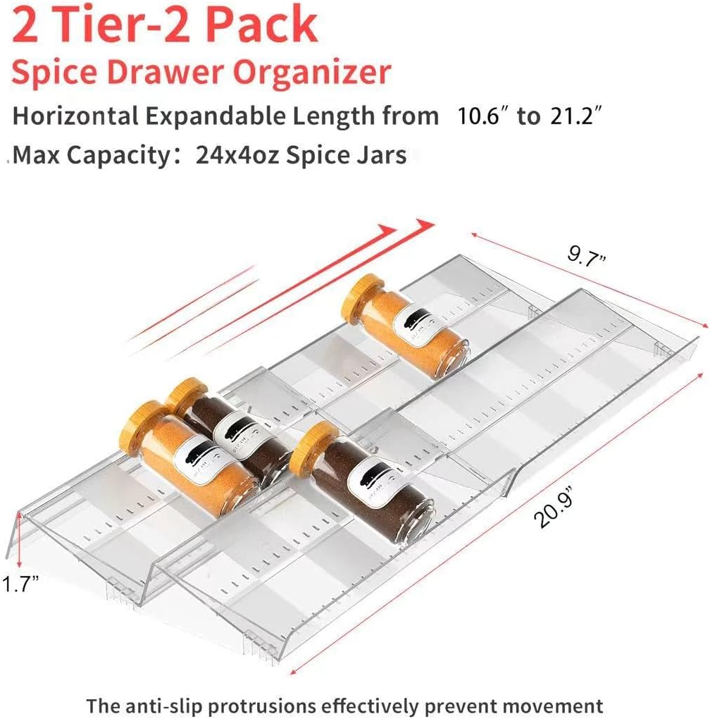 • 【Customize Your Spice Storage】 Optimize your kitchen with a spice rack that adapts to your needs. This expandable organizer fits drawers 10.63'' to 21.14'' wide. Choose the 2-Tier 2-Pack for shallow drawers or the 4-Tier 4-Pack for deeper storage. Featuring anti-slip silicone pads and raised acrylic ridges, it prevents spice jars from sliding, ensuring secure and stable storage.