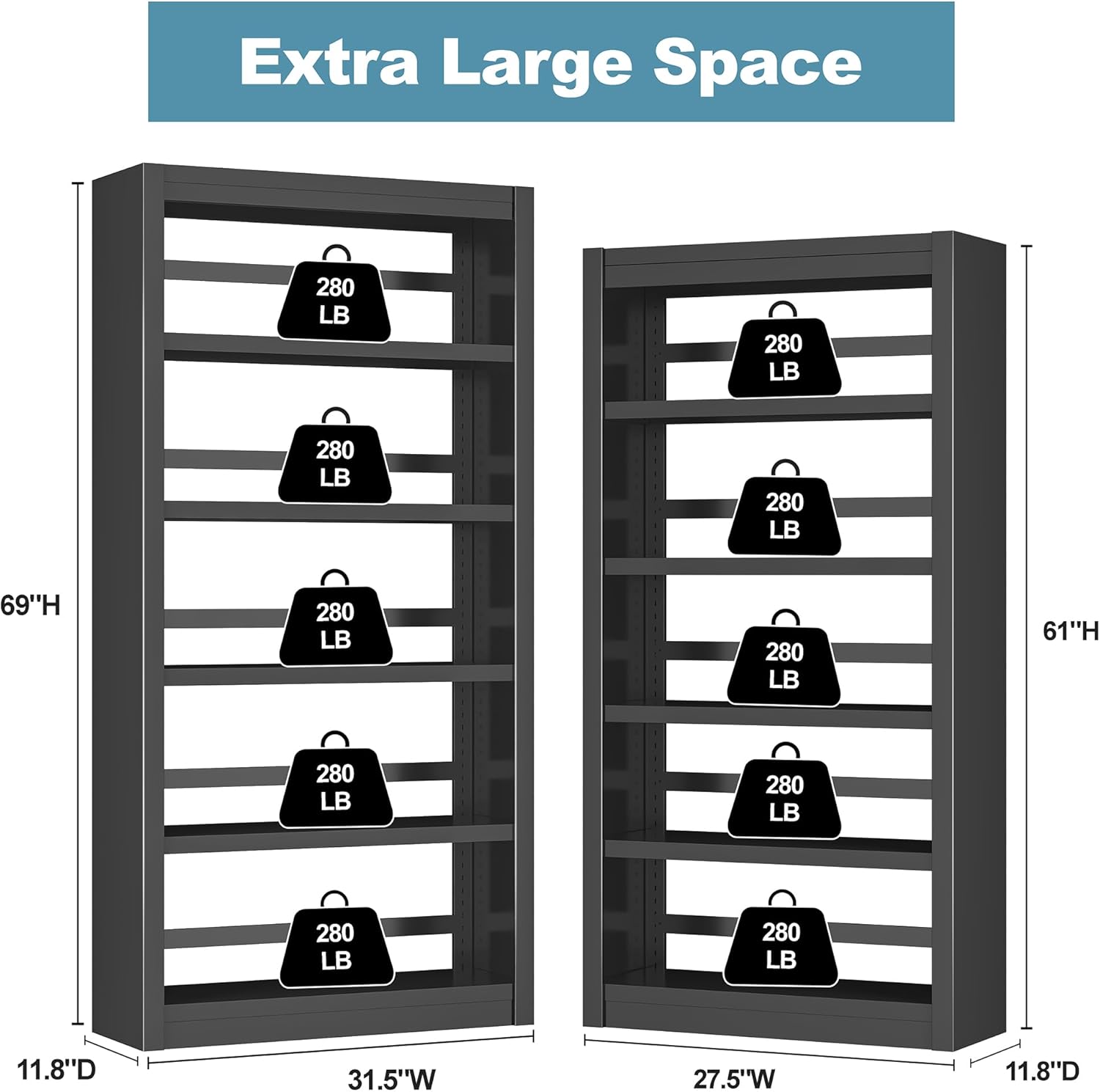 • 【Spacious & Heavy-Duty Design】This 5-tier metal sturdy bookshelf supports up to 280lbs per shelf, making it perfect for storing books, files, decor, or even heavy equipment. Ideal for both home and office use, it’s a top choice for heavy duty storage and office storage solutions.