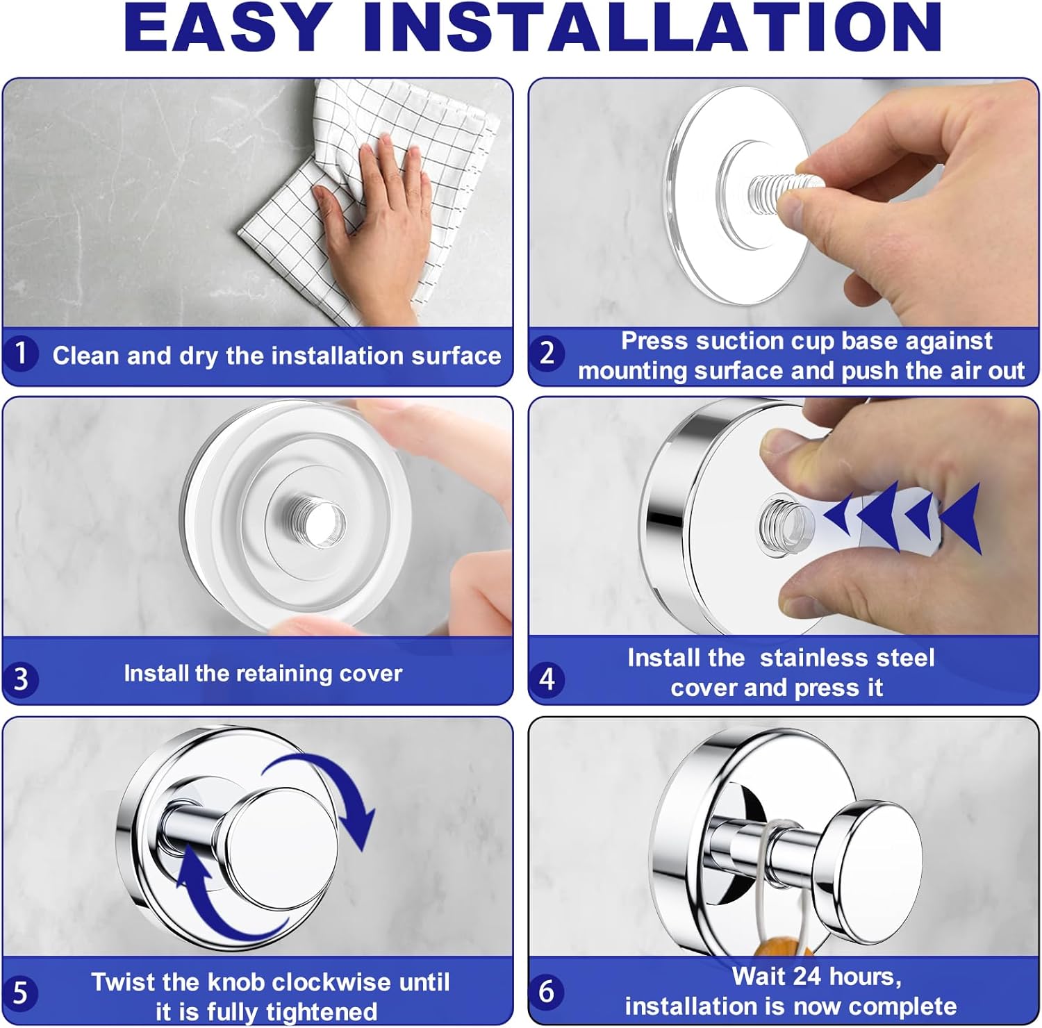 • [Effortless Setup in 3 Steps]: 1. Clean & Dry a smooth, non-porous surface; 2. Loosen the hook counter-clockwise, take out the suction cup base; 3. Press the base against the surface and twist the knob clockwise until fully tight. Watch our video for detailed instructions.