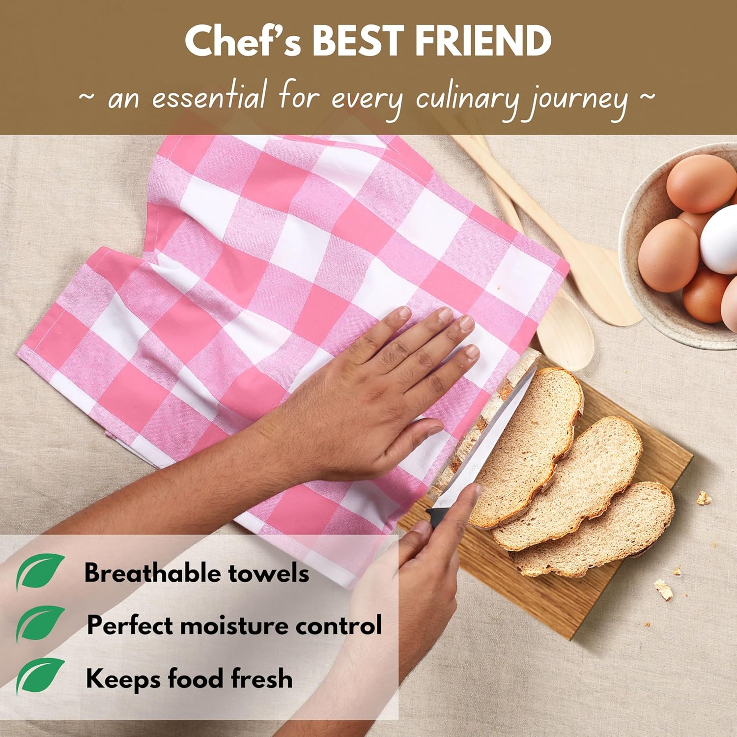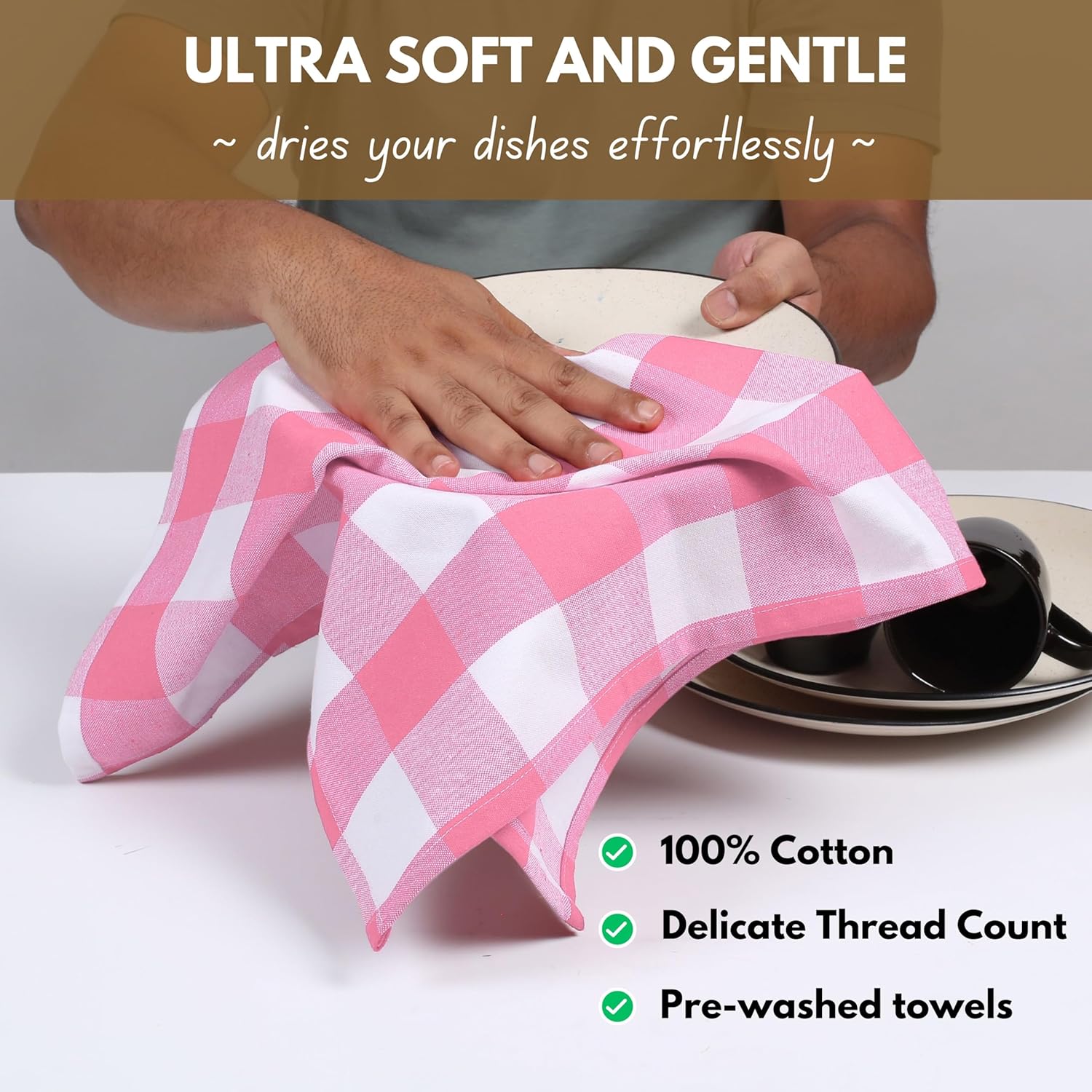 Native Fab Pink Checked Kitchen Towels 16"x26" - 6 Pack Buffalo Plaid Cotton Dish Towels - Absorbent Dishcloth Set, Soft Reusable Towel with Hanging Loop - Pink White
