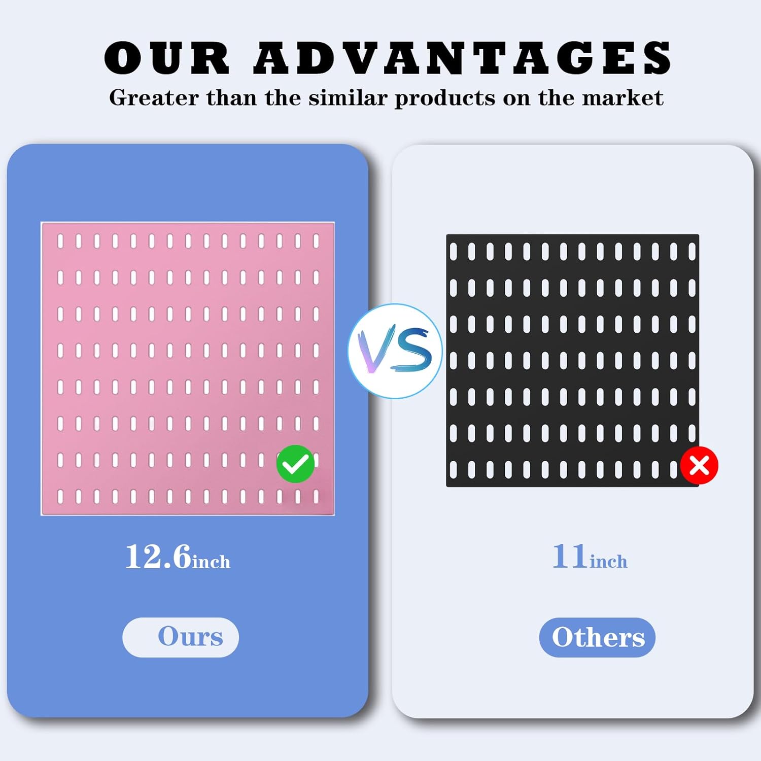 • Including: The pegboard organizer pack includes 4 bigger pegboard panels each with 12.6" x 12.6", 4 containers 3.5’’ x 3’’ x 3.1’’, 2 shelves 12.6’’ x 3.5’’ x 1.2’’, 1 letter holder 7.3’’ x 4.9’’ x 2.2’’, 4 long hooks 2.4’’ x 3.7’’, 5 hooks 1’’ x 2.4’’, and 4 clips 0.8’’ x 3.1’’