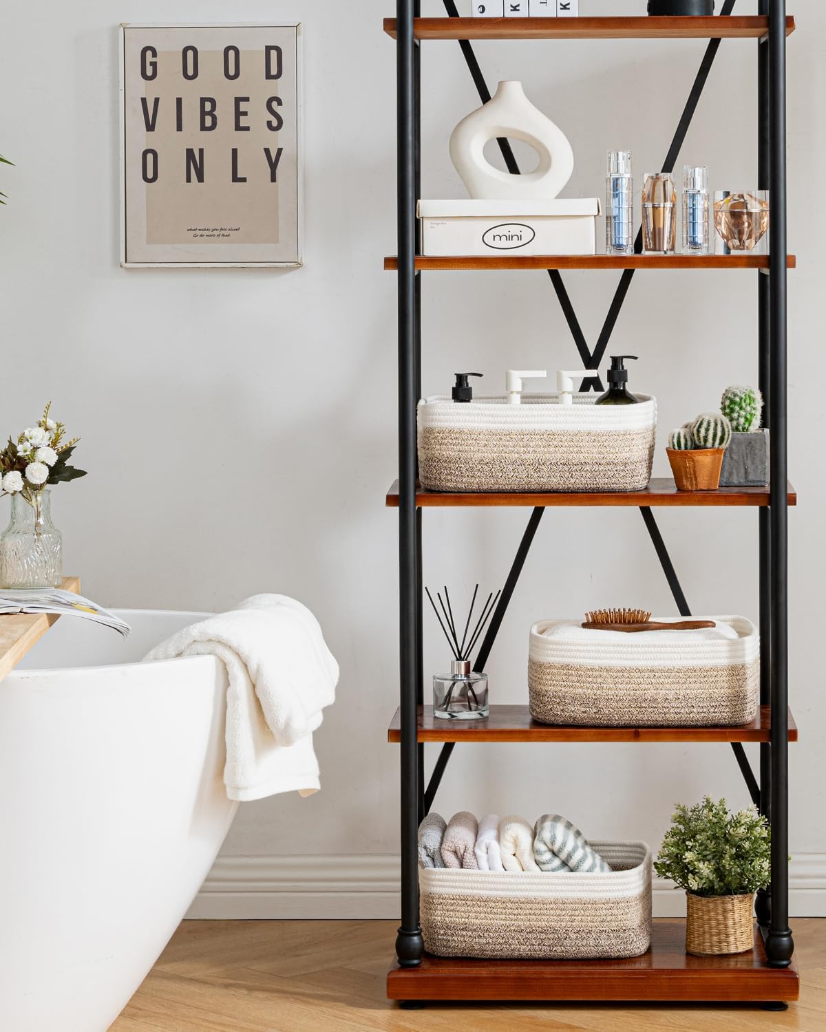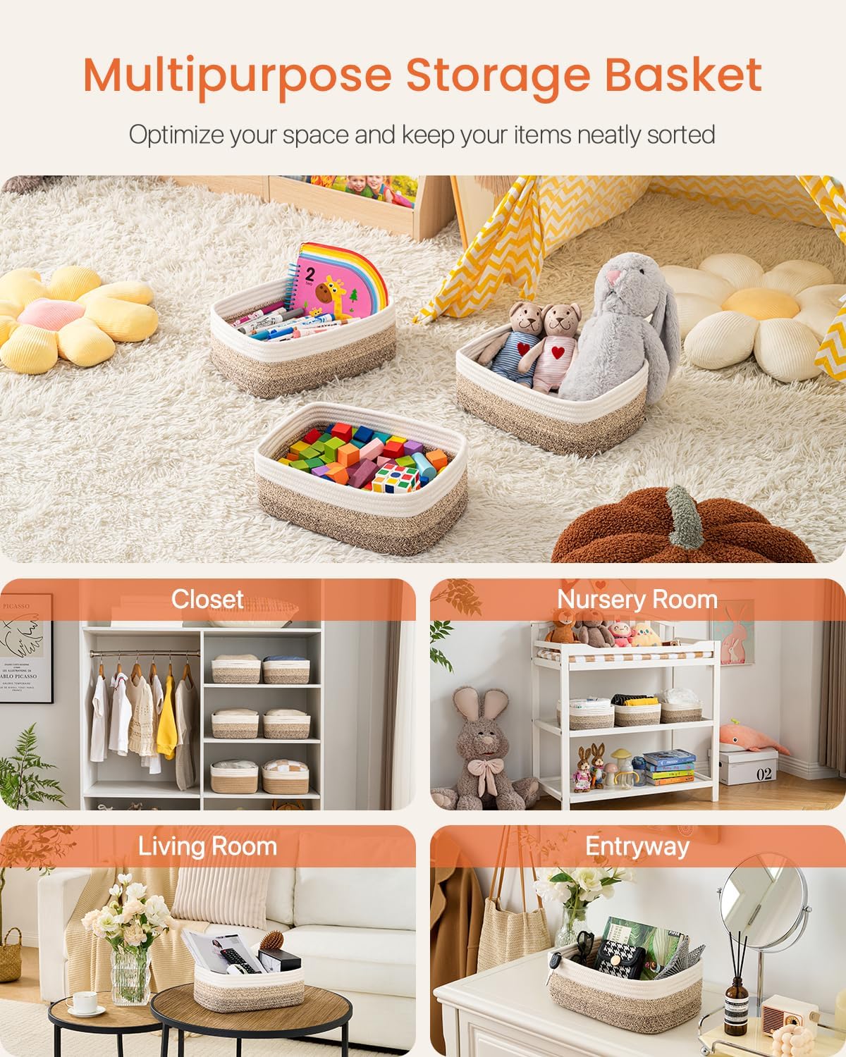 • [ Elegantly Designed to Match Any Décor ] Our small rope basket creates a minimalist appearance, and it adds a touch of warmth and texture to any room. The classic solid color design ensures seamless integration with your existing aesthetics, complementing any decoration. Perfect as decorative storage baskets for shelves, cabinets, and any open display space, making them a stylish and practical addition to any decor, enhancing the overall aesthetics of your room