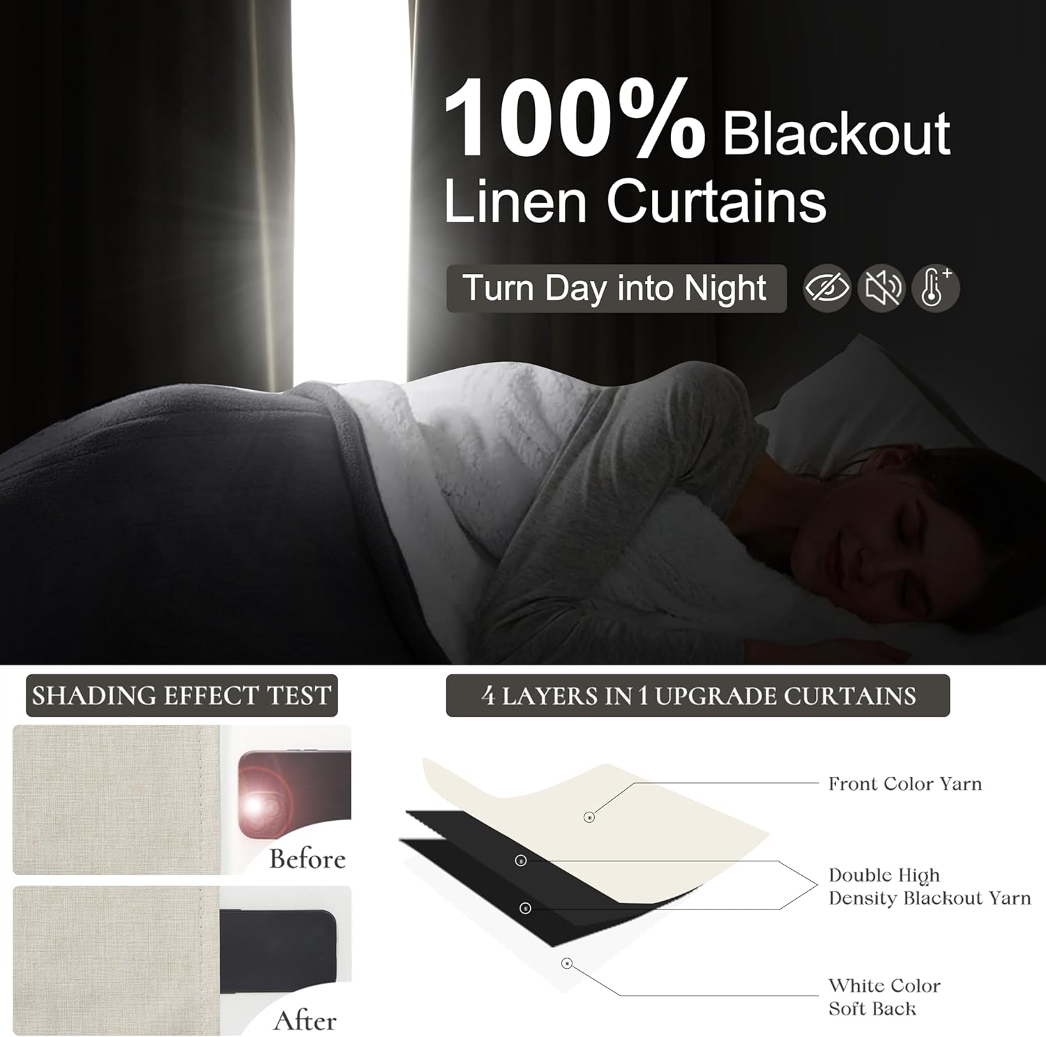 • 100% Blackout Curtains:White backing definitely can block out full sunlight,uv rays and work well in thermal insulating,noise reducing,balance temperature.Providing complete darkness and privacy in a room, which you can enjoy your sweet sleeping anytime
