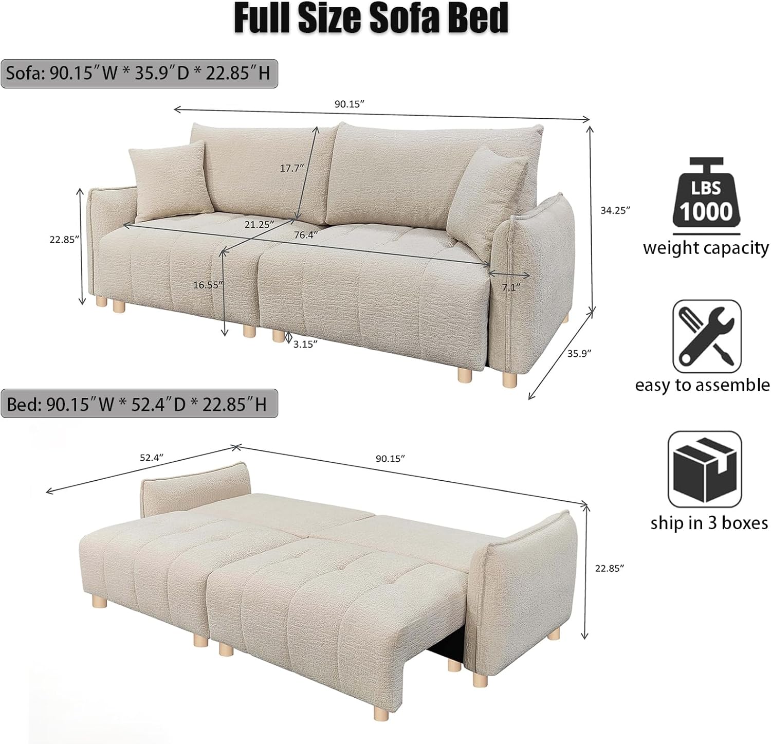 Convertible Sofa Bed, 90" Full Size Sleeper Sofa with Storage, Tufted Chenille 3 Seat Sofa Couches for Living Room, Small Spaces, Guest Room, Apartment, Beige