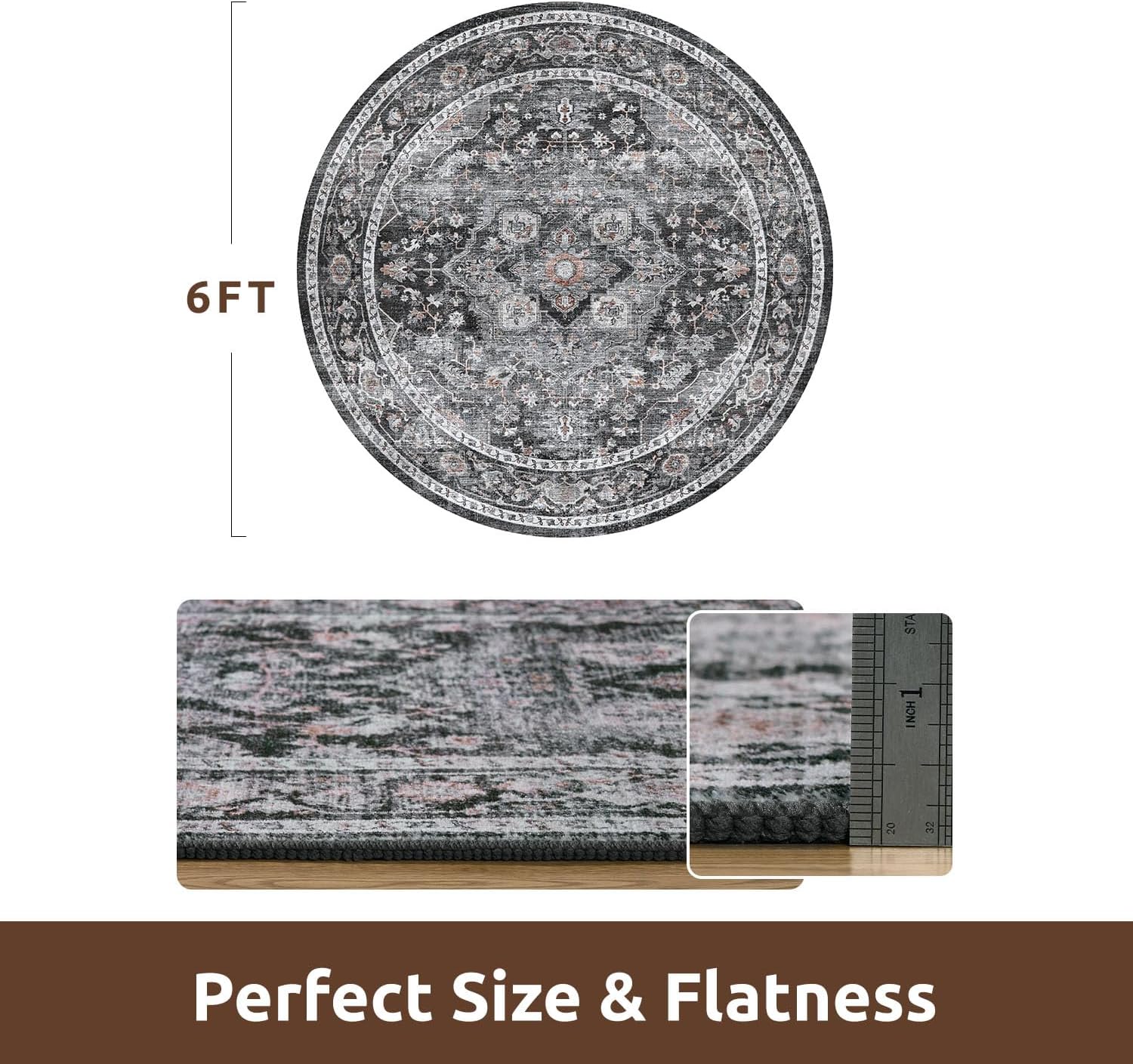 AMOAMI-6FT Round Rug-Rugs for Living Room-Vintage Soft Black Rugs for Bedroom-Non Slip Circle Rug-Machine Washable Rug for Dining Room Living Room Bedroom Office Under Table Dark Grey & Black