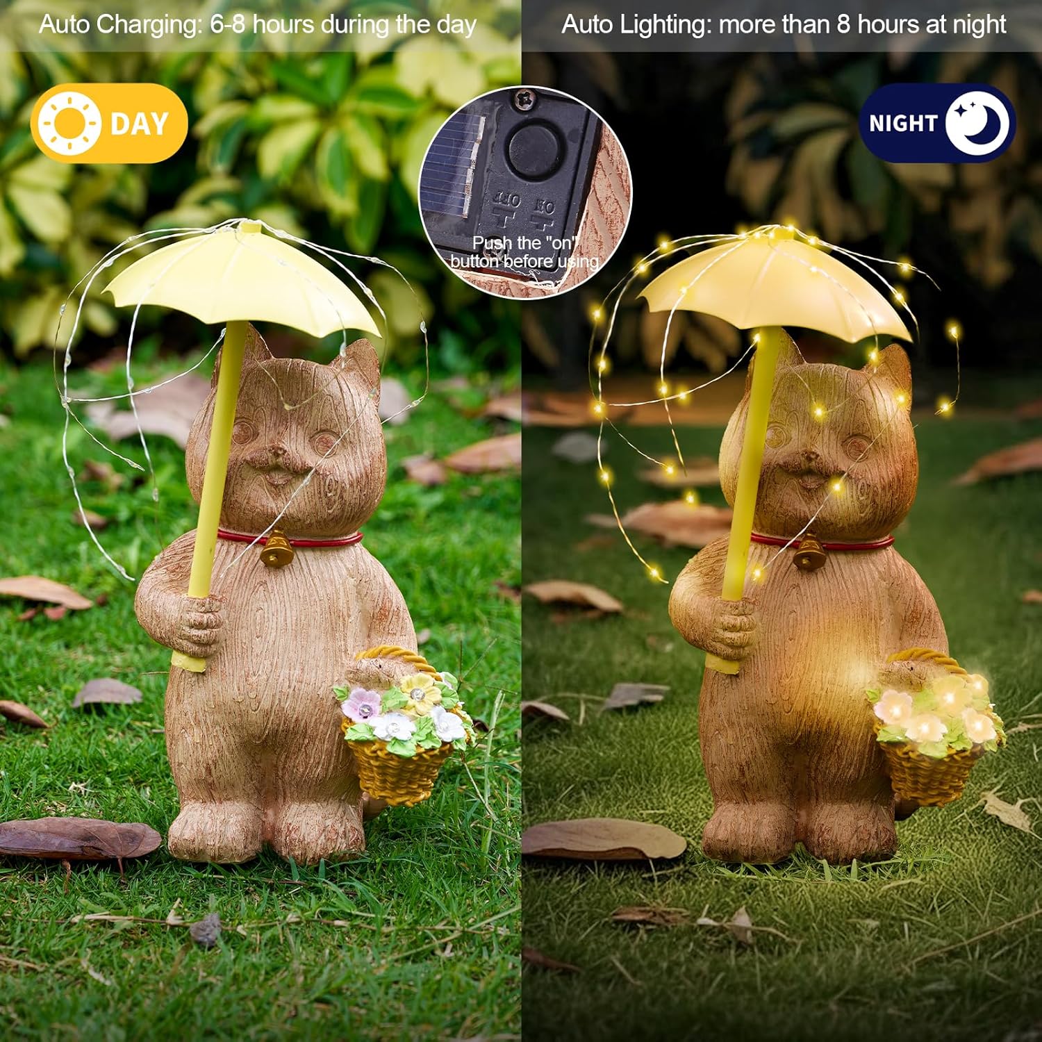 • [Charming Solar Garden Lights] This solar garden cat statue features a kitten holding a flower basket and an umbrella, beautifully illuminated by solar lights nestled inside the basket and string lights cascading from the umbrella top. Perfect for garden decor, patio decor, outdoor decor, front porch decor, and fairy decor lovers