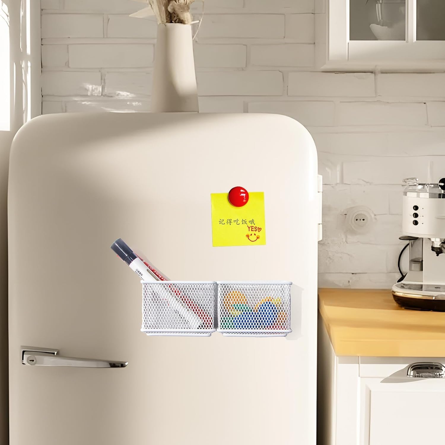 • Storage Helper: The small storage cabinet magnetic pen holder can be used to organize essential writing supplies, such as markers on the magnetic whiteboard, pens and pencils on the desktop, as well as scissors, sticky notes and small kitchen items