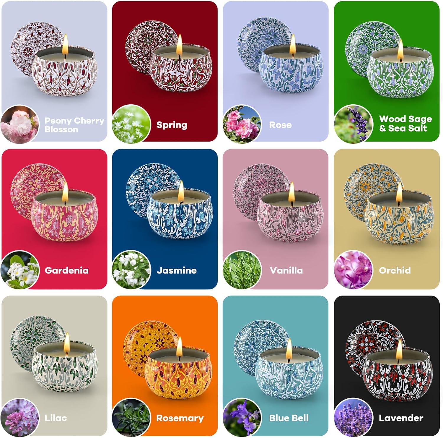 • Various Scented Candles Available: Contains 12 Scents: Rose Bluebell, Lavender, Orchid, Spring, Jasmine, Peony Cherry Blossom, Gardenia, Wood Sage& Sea Salt, Lilac, Rosemary, Vanilla, Whether you're looking for something bold and masculine or soft and comforting, there's a fragrance waiting to be discovered