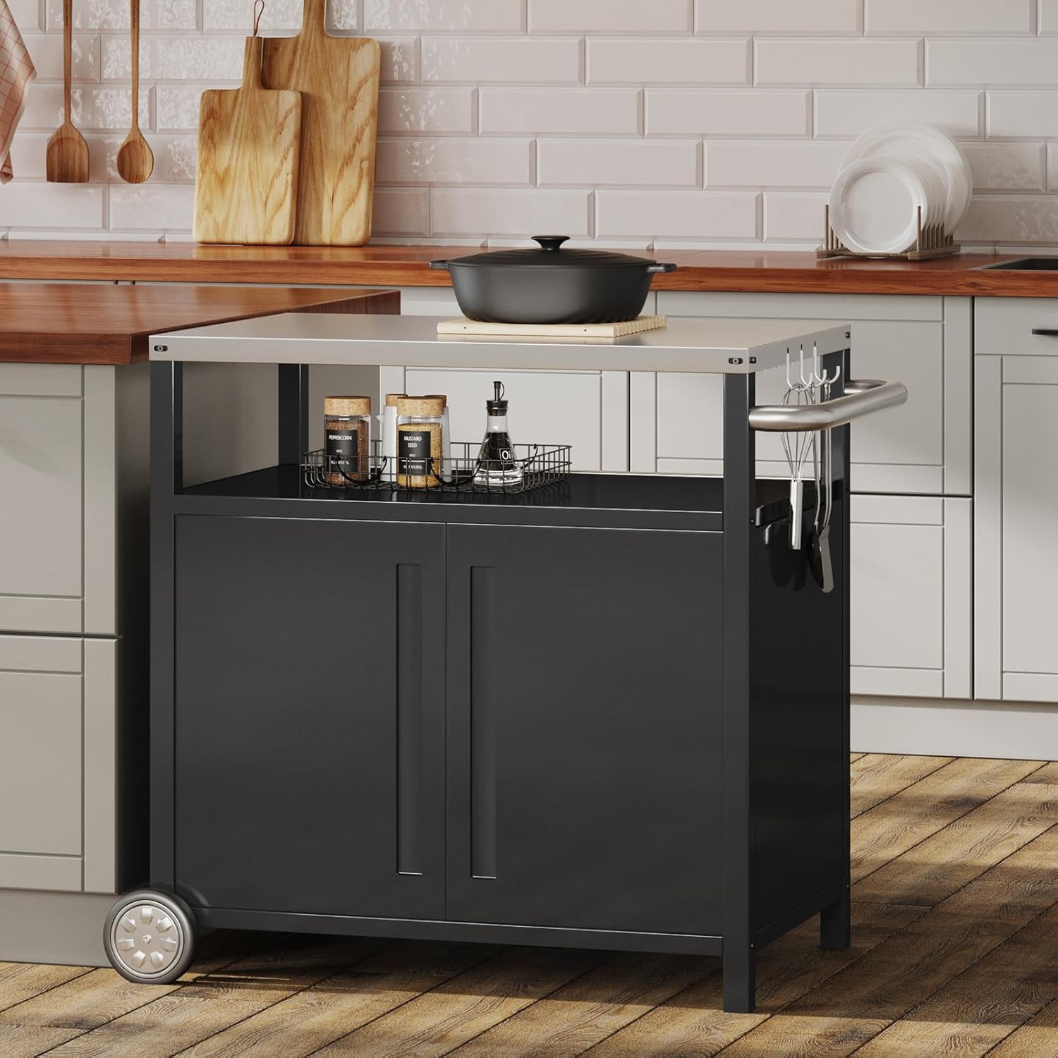 • Dimensions and Capacity The cart measures 24 inches in depth, 31.5 inches in width, and 33.5 inches in height. Its 201-grade stainless steel top provides an efficient space for preparation and serving. The top can support a weight of up to 220 pounds, while the second and bottom cabinets can hold up to 110 pounds each. This ample storage space is perfect for keeping all your kitchen essentials within easy reach, from pots and pans to appliances and ingredients.